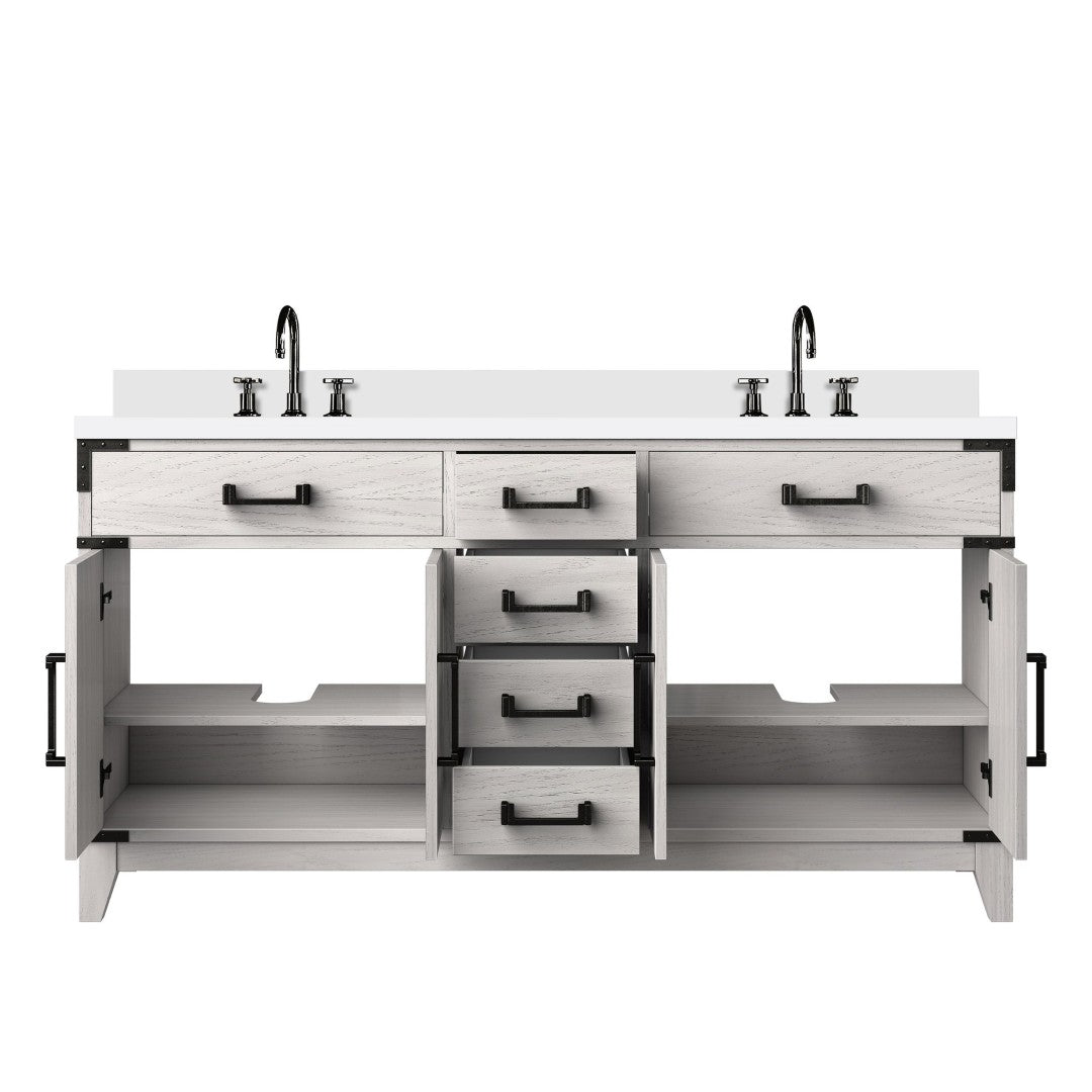 - Countertop: White quartz tops, polished, hand-finished and sealed twice for enhanced longevity and stain resistance