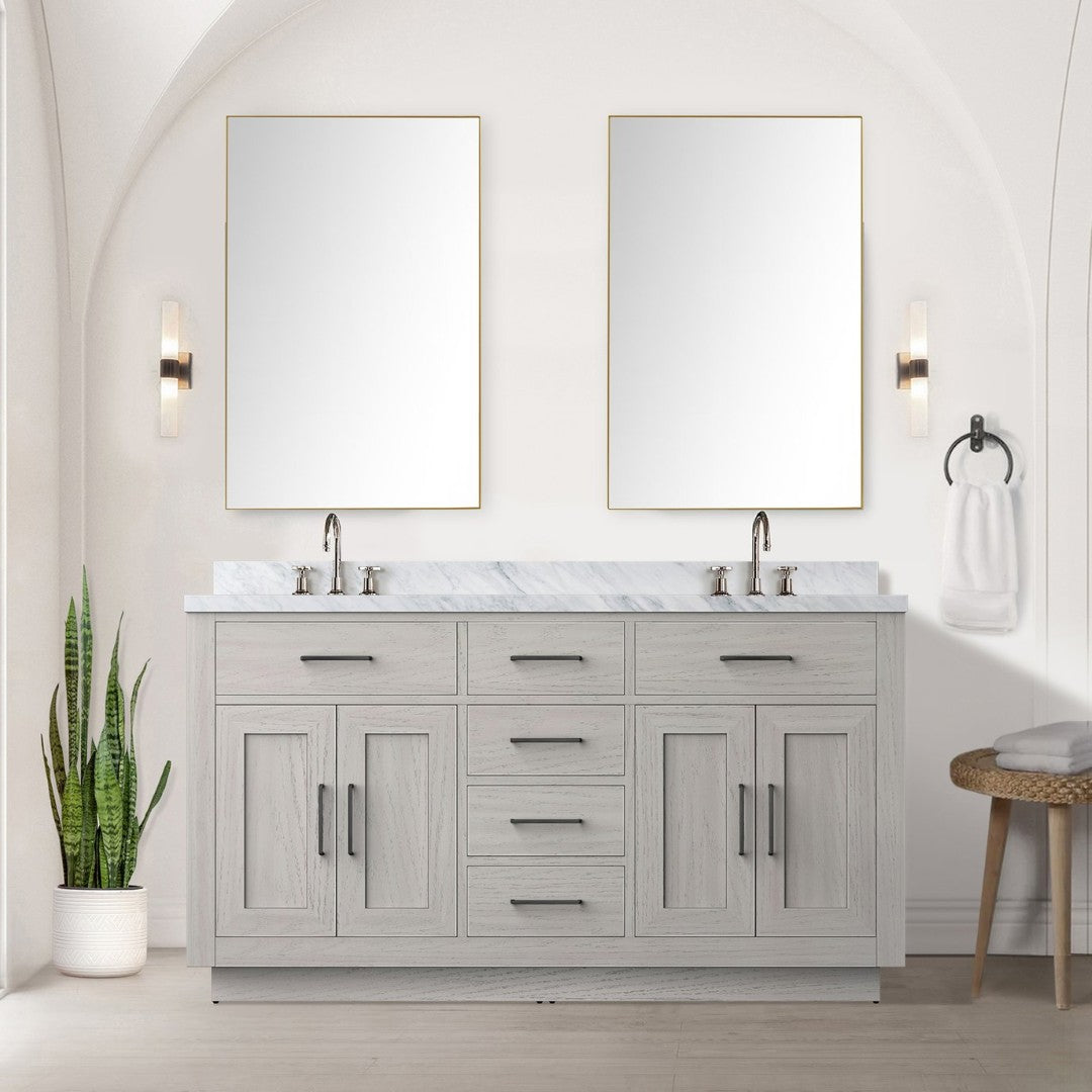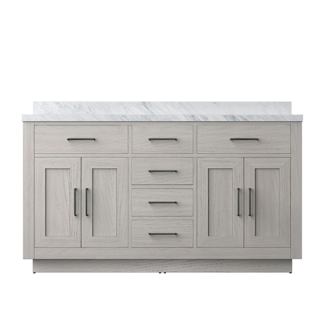 Elevate your bathroom with this elegant White Oak double vanity, featuring a luxurious Carrara marble top and a solid wood construction for lasting beauty and function. Designed for convenience and style, this fully assembled unit blends classic materials with modern features—ideal for busy renovations or upscale new builds.