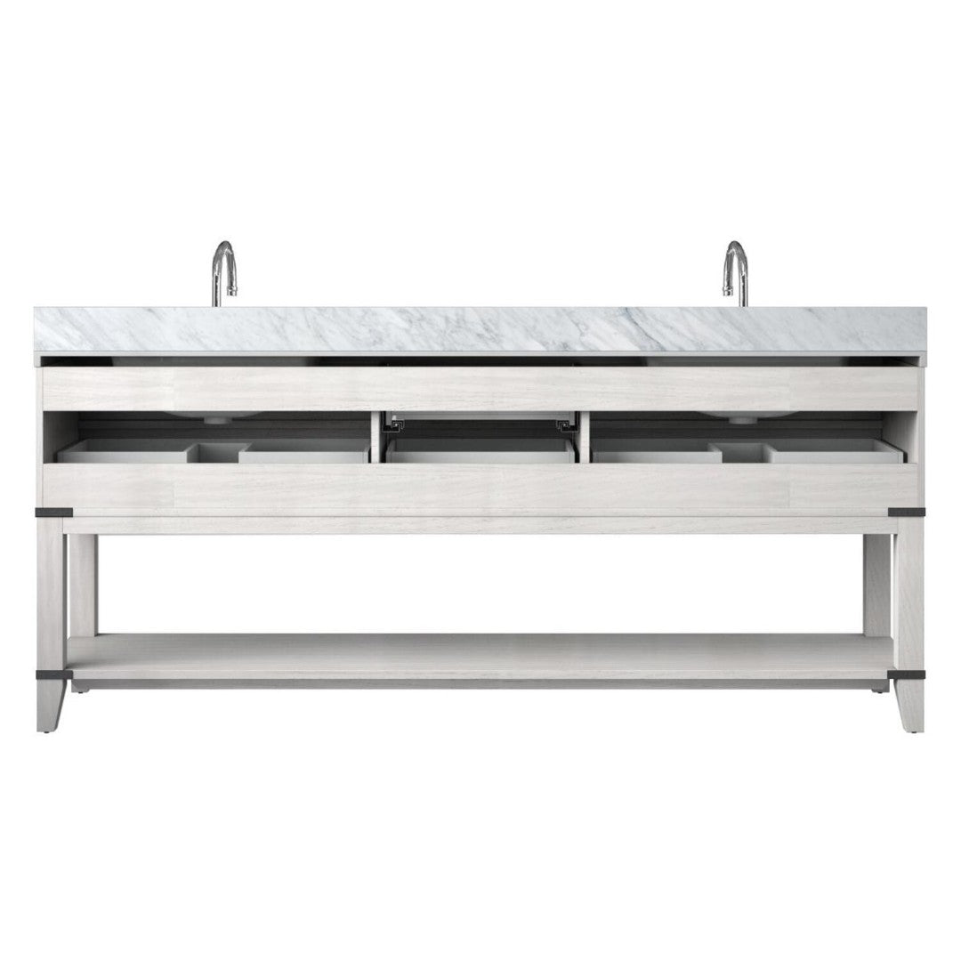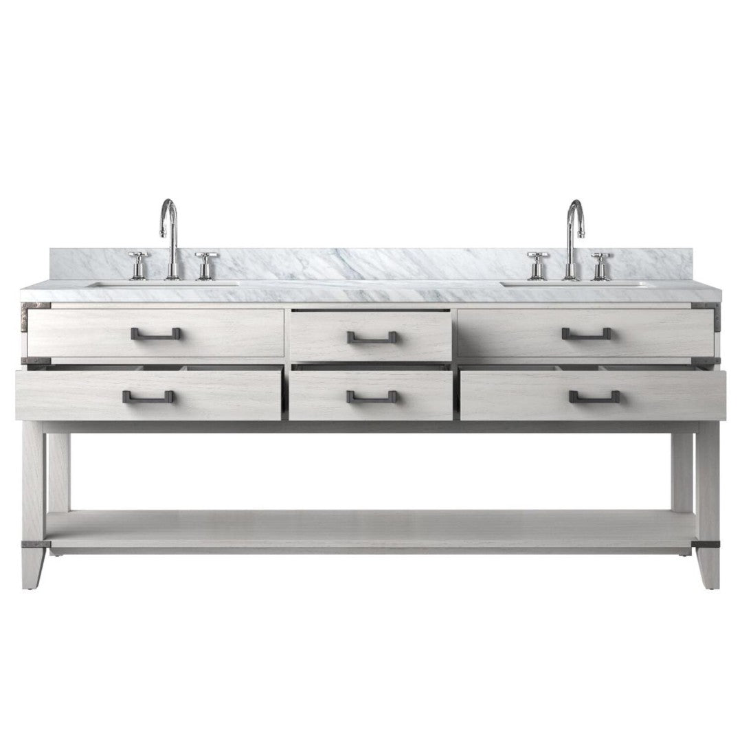 Transform your bathroom into a refined, functional space with this White Oak double vanity. Expertly crafted from solid wood and topped with hand-finished Carrara marble, it combines timeless materials with modern conveniences—ample storage, soft-close drawers, and an included chrome gooseneck faucet set—delivering both luxury and everyday practicality.