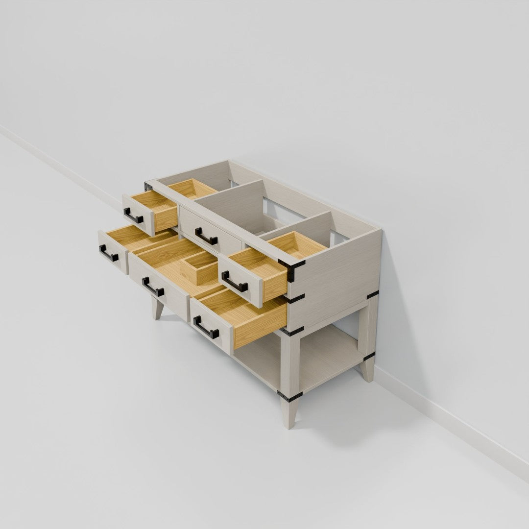 - Storage Configuration: Five drawers plus an open cabinet shelf for towels, toiletries, and everyday essentials