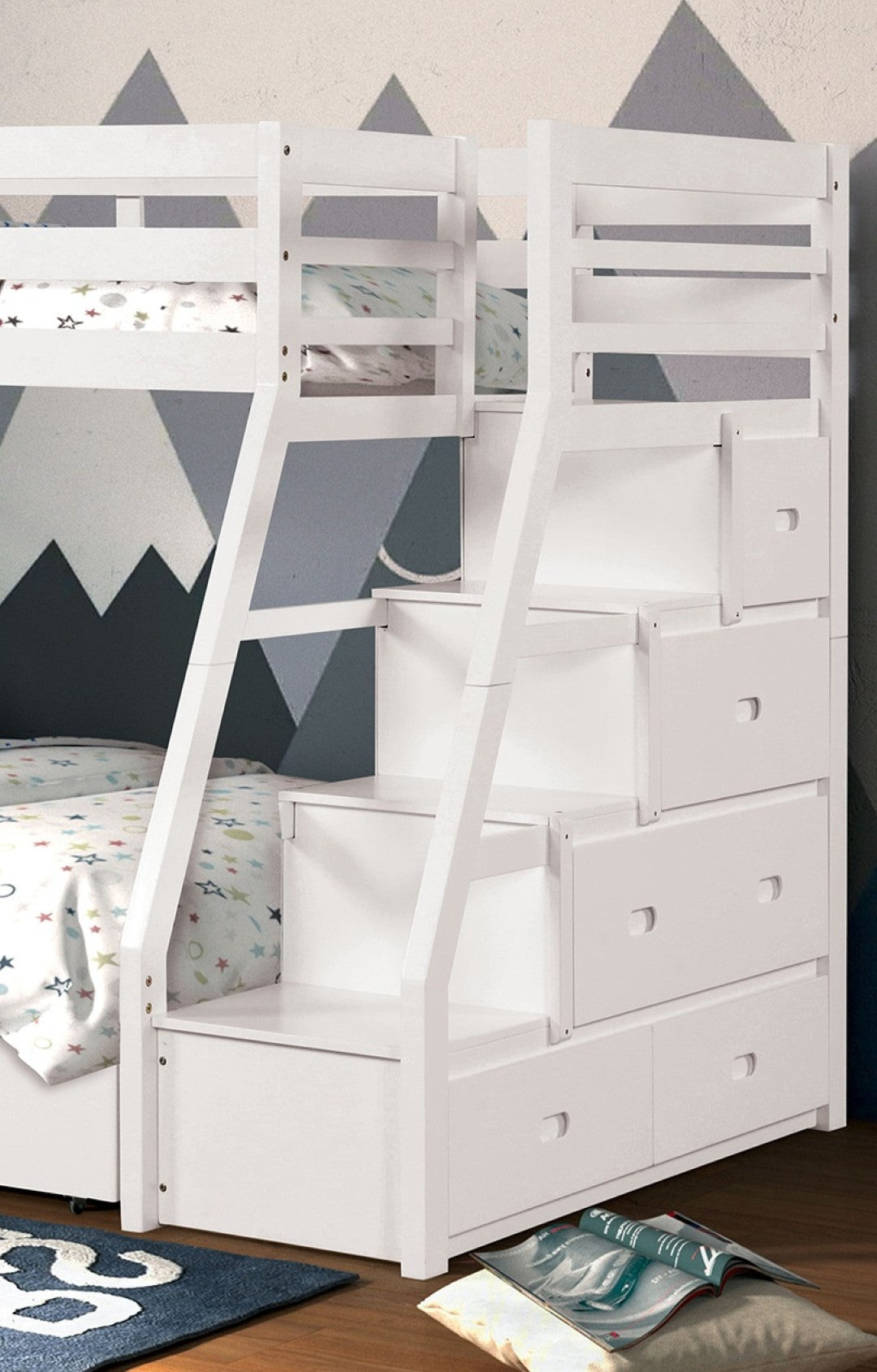 Give your child’s bedroom a practical, stylish upgrade with this white transitional twin-over-full bunk bed. Combining classic lines with modern functionality, it maximizes sleeping capacity and storage while prioritizing safety and durability. The included trundle, built-in drawers, and accessible stepped design make it ideal for siblings, sleepovers, or guest space without sacrificing everyday usability.