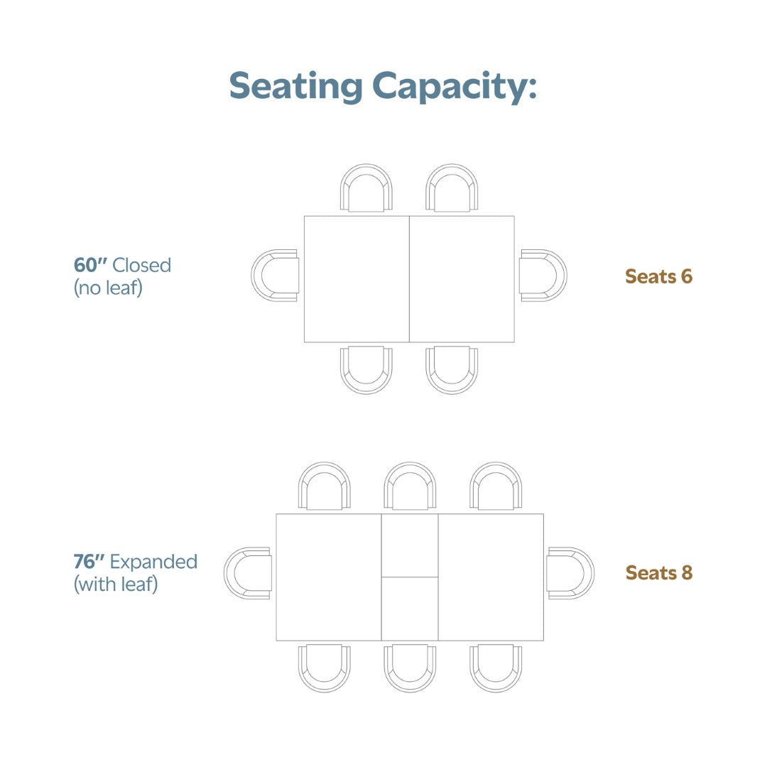 - Expandable design with a concealed butterfly leaf—extends from 60" to 76" to accommodate 6 people when closed and up to 8 when open