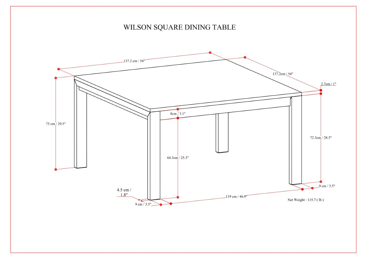- Measuring 54-inches square, this handcrafted, transitional-style dining table comfortably accommodates up to 8 people and supports up to 220 lbs; it has a 25.3-inch leg clearance, from the floor to the table apron.