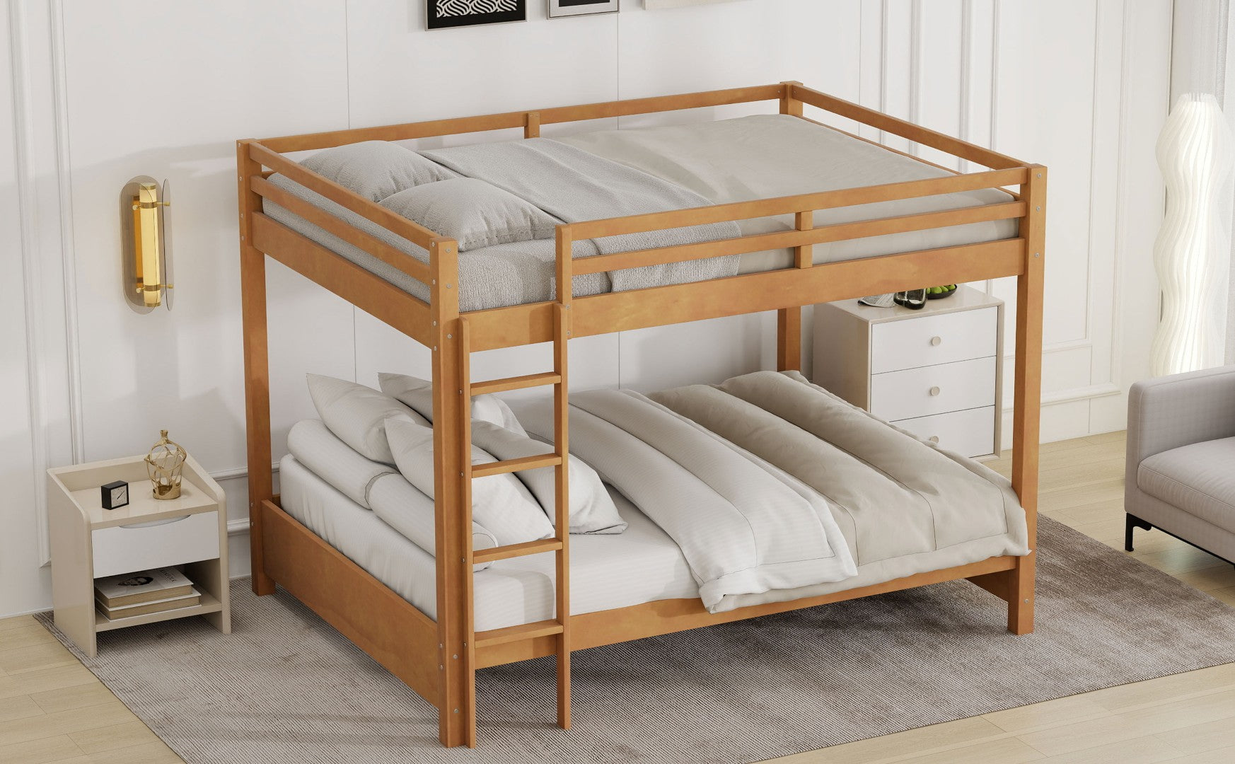 This spacious queen-size bunk bed combines classic wood-tone styling with a sturdy, family-friendly design — ideal for maximizing sleeping space in shared bedrooms, guest rooms, or vacation rentals. Built from solid pine and MDF, it offers reliable strength and safety features while providing a clean, adaptable look that complements many decor styles. Its generous dimensions and thoughtful construction make it a practical choice for households that need large-capacity sleeping arrangements without sacrificing aesthetics.
