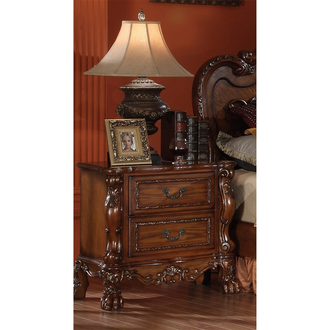 Elevate your bedroom with this elegant wooden nightstand, thoughtfully crafted to combine classic details with practical storage. Its carved inlay veneers, claw feet, and brushed contrast accents bring timeless charm, while two smooth-gliding drawers offer organized space for bedside essentials.