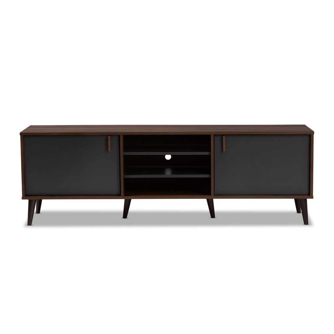 Give your living room a clean, mid-century modern centerpiece with this stylish TV stand. Combining warm brown engineered wood with dark grey doors and tapered, angled legs, it offers refined aesthetics plus practical storage for media devices, gaming consoles, and accessories. Cable-management cutouts keep cords tidy, while five shelving areas and two closed cabinets provide flexible organization for your entertainment components.