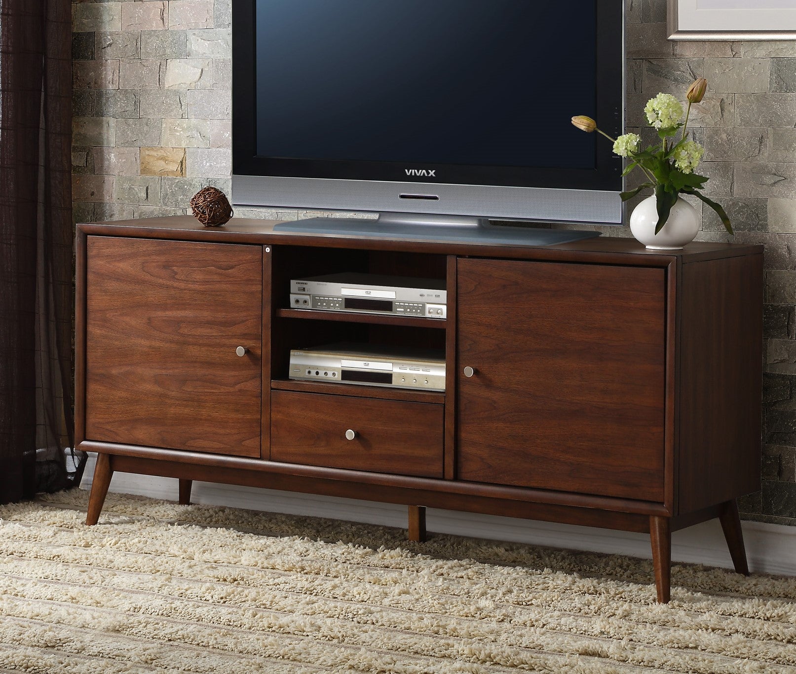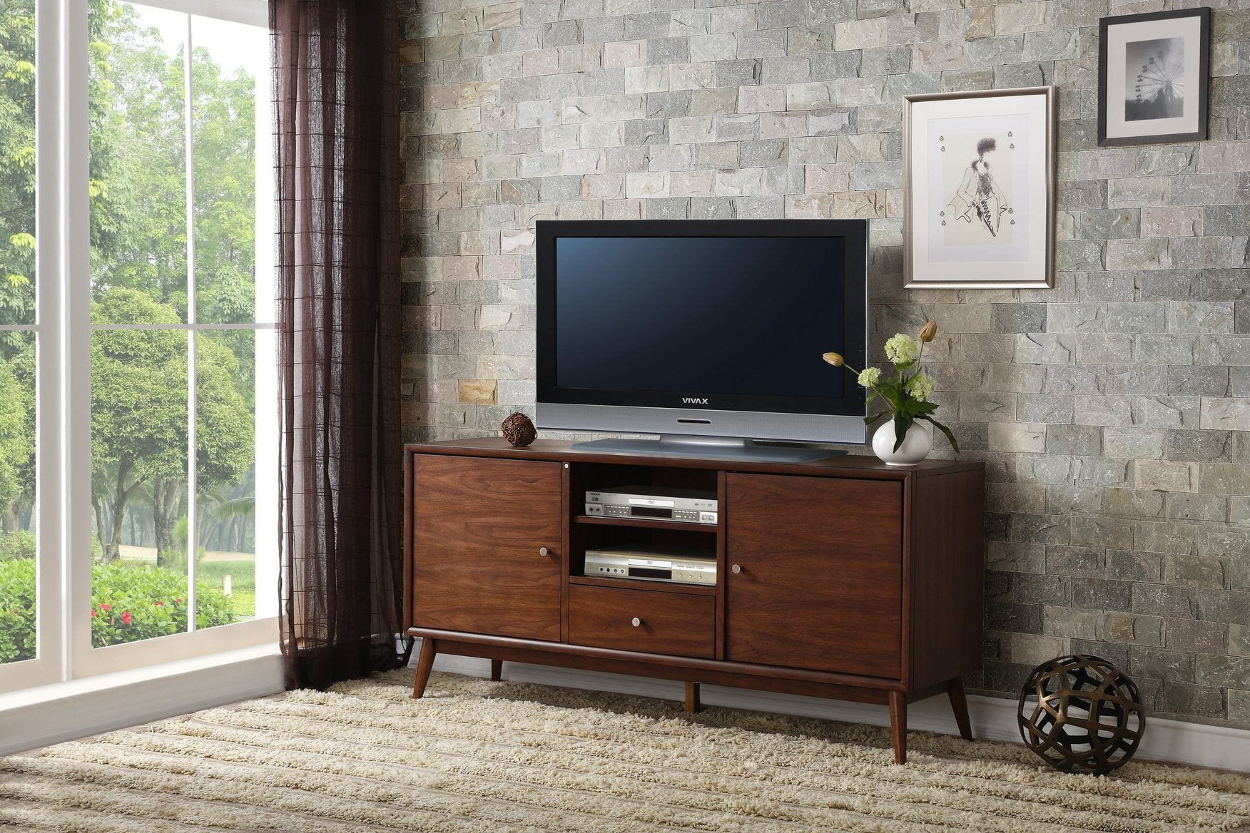 Elevate your living room with this retro-modern TV console that combines style and practical storage. Crafted in a warm brown finish with polished nickel knobs and a mid-century inspired silhouette, this versatile piece offers ample drawer and shelf space for media components, accessories, and décor while keeping cables and devices accessible through open media compartments. Ideal as a TV stand or media center, it complements contemporary and classic interiors and pairs well with coordinating items in the Frolic Collection.