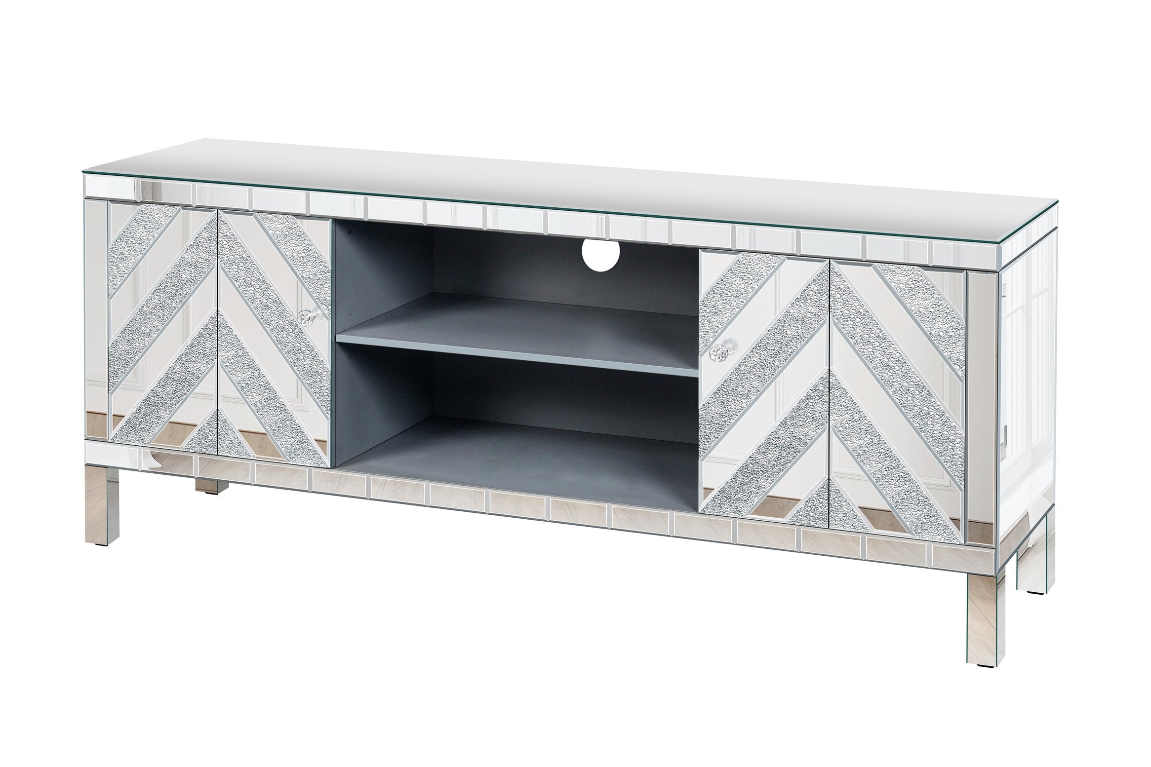 Bring glamour and practical storage to your living room or bedroom with this mirrored media console. Designed to showcase up to a 50-inch TV, the console combines a reflective diamond-glass finish with solid construction and organized storage—ideal for modern, contemporary, or glam interiors.