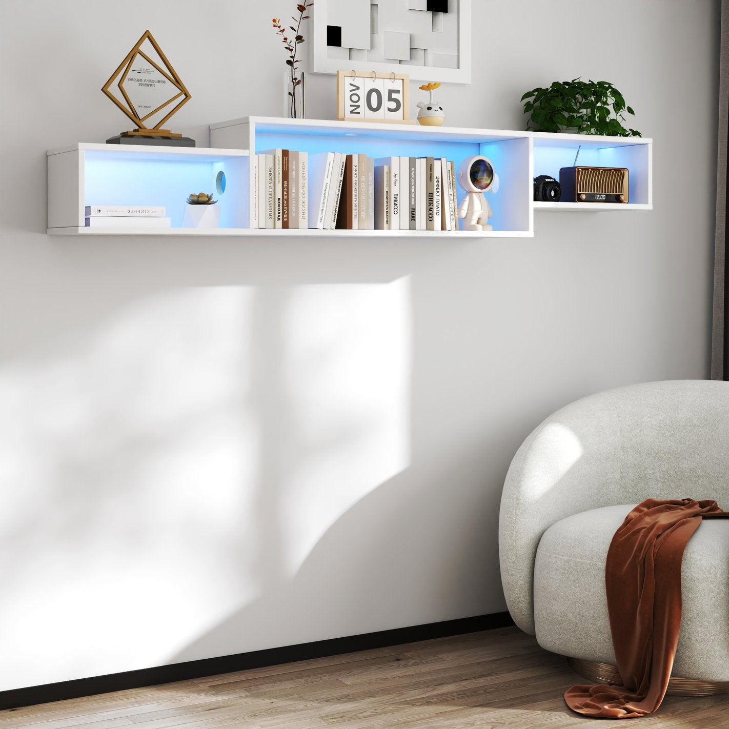 Bring sleek, modern organization to your living room with this wall-mounted floating TV stand. Designed for space-saving style and optimized media organization, the shelf complements contemporary decor while keeping electronics and accessories neatly stored. Integrated 20-color LED lighting adds ambient flair, and a built-in charging station helps keep devices powered and clutter-free.
