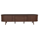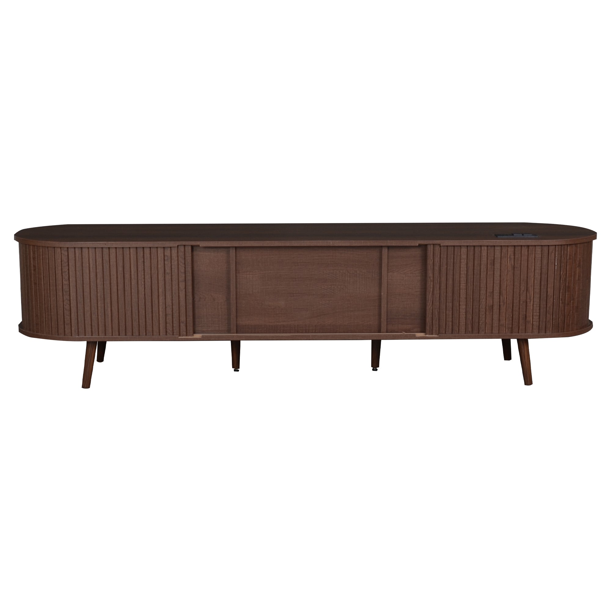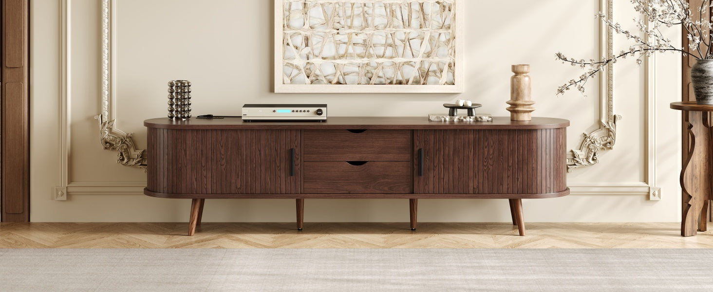 Give your living room or bedroom a refined focal point with this mid-century modern TV console. Combining classic rattan-front drawers, smooth tambour sliding doors, and solid wood legs, it delivers both style and practicality. Thoughtfully engineered for everyday use, the unit features a waterproof surface, integrated power outlets and USB ports for easy device charging, and flexible storage that keeps media components and accessories organized and out of sight.