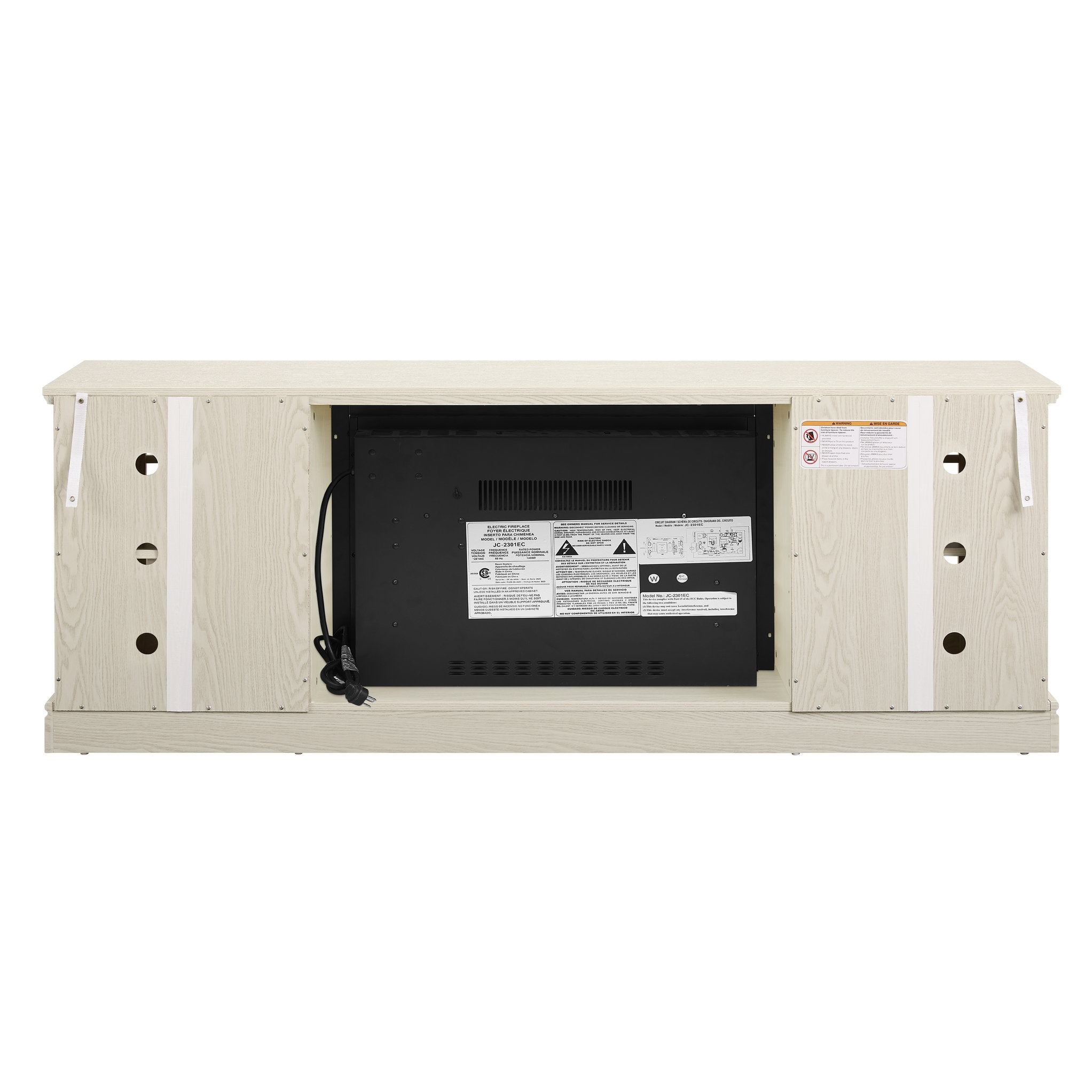 Transform your living room into a cozy, modern entertainment hub with this large white media console that combines generous storage, a realistic faux-stone electric fireplace, and smart cable management. Designed for contemporary spaces, it supports large TVs while keeping components organized and the atmosphere warm and inviting—without the hassle of a real hearth.