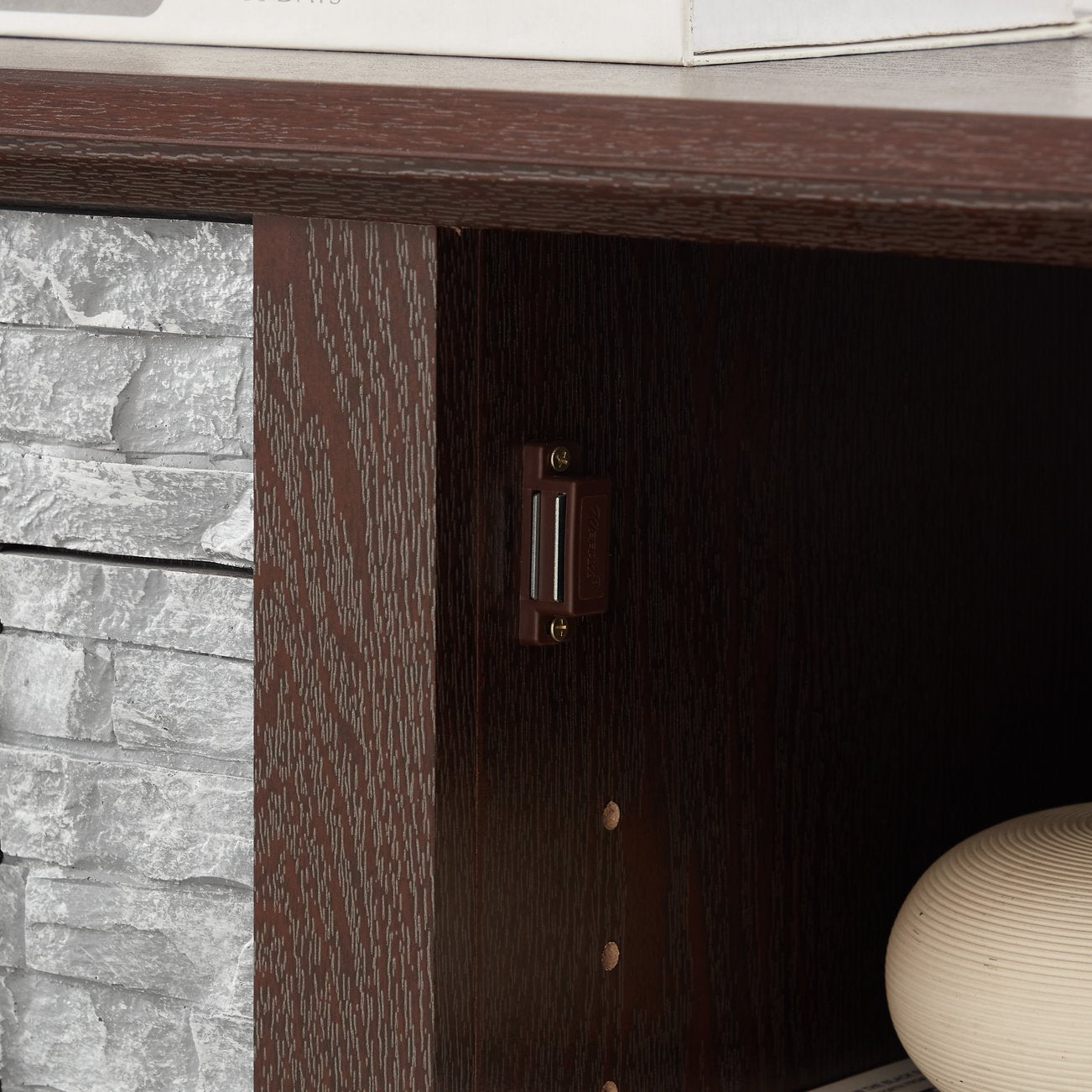 - [Faux stacked stone surround] It gives this fireplace entertainment center a traditional style and with two doors and plenty of shelving, you can keep your space neat and tidy.