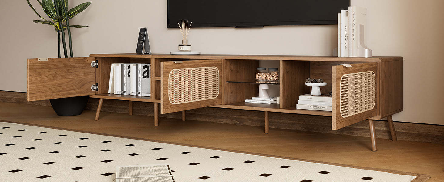 This stylish and functional TV console combines natural materials with modern utility to elevate your living room, bedroom, or entertainment center. Thoughtful details—like interwoven rattan doors, tempered glass open shelving, soft-closing hinges, and solid-wood legs—create a refined centerpiece that balances concealed storage with display space. Built for everyday use and lasting appeal, it keeps media components organized while enhancing your décor with warm walnut tones and textured woodgrain.