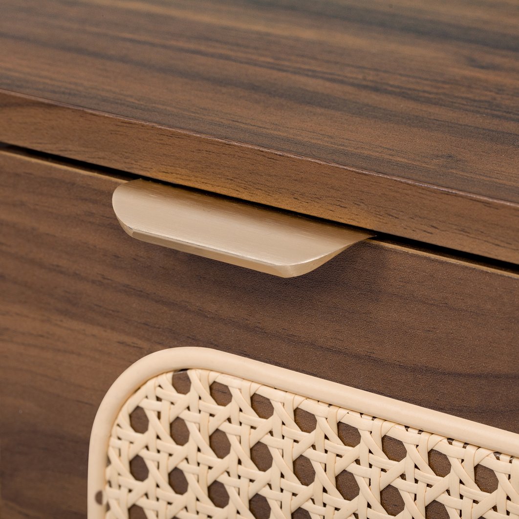 - Materials & Finish: MDF cabinet with solid-wood legs and textured walnut woodgrain finish; PVC rattan doors; metal hardware
