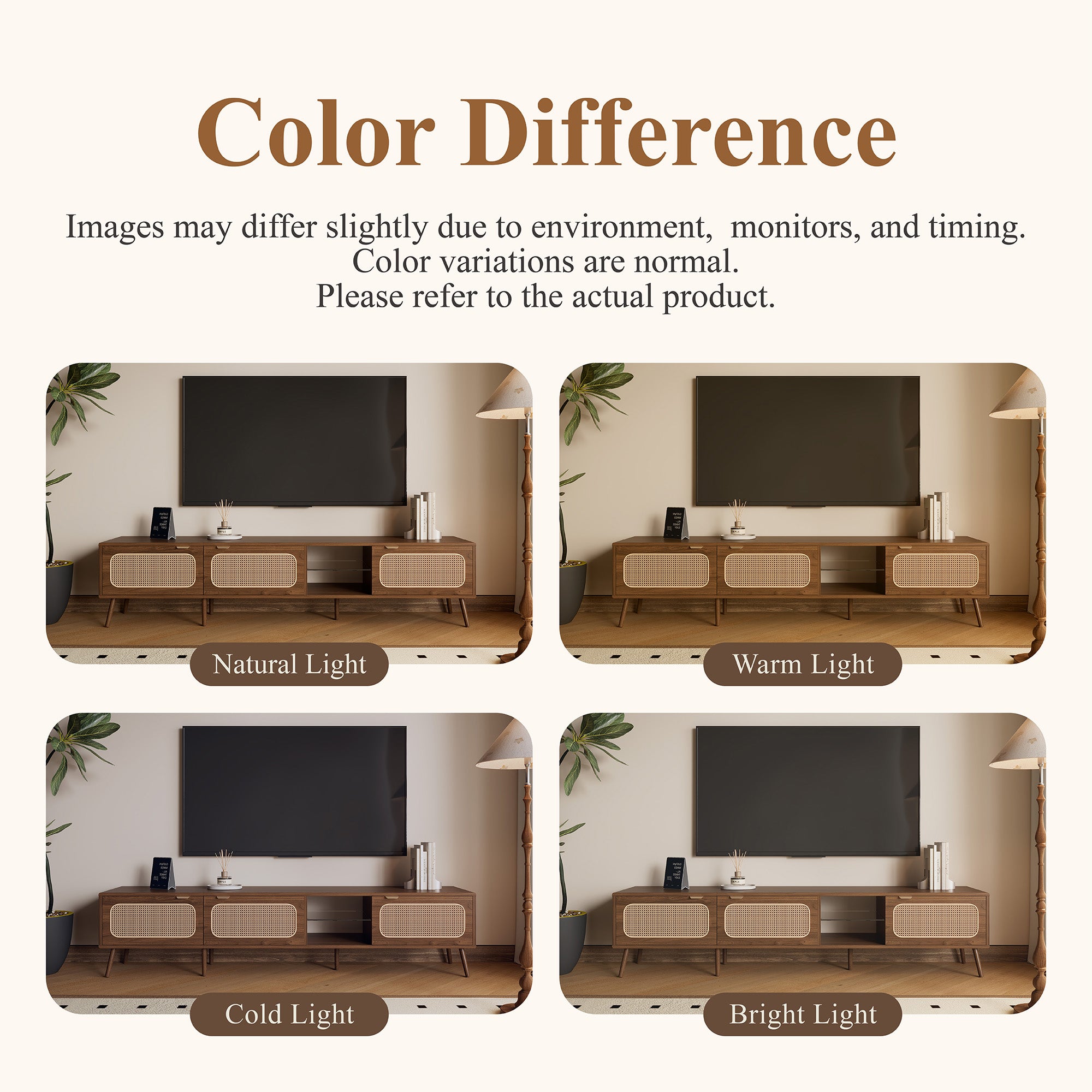 - Functional Details: Finger-pull handles and premium soft-closing hinges for quiet, smooth operation; rattan panels allow subtle airflow to electronic components