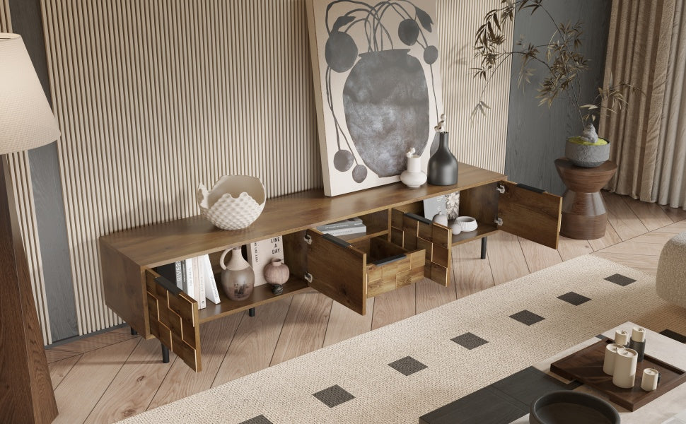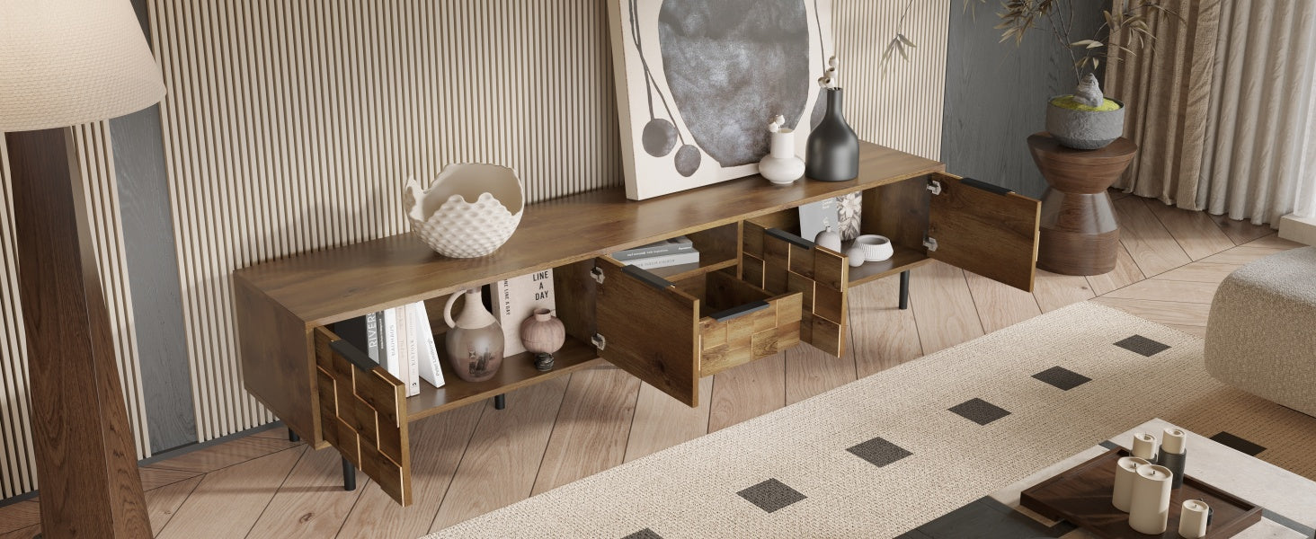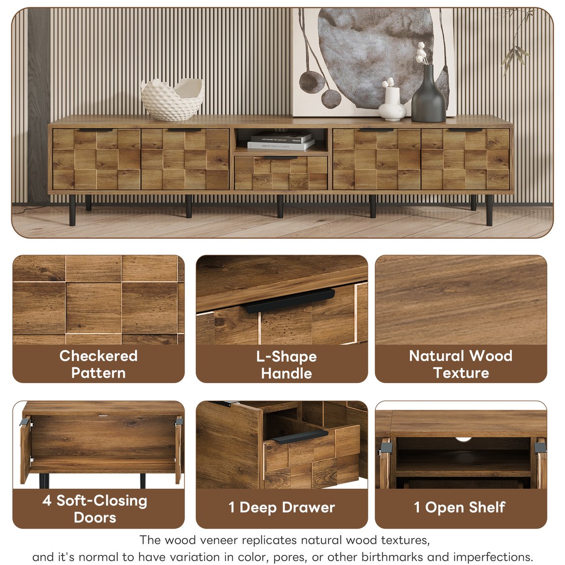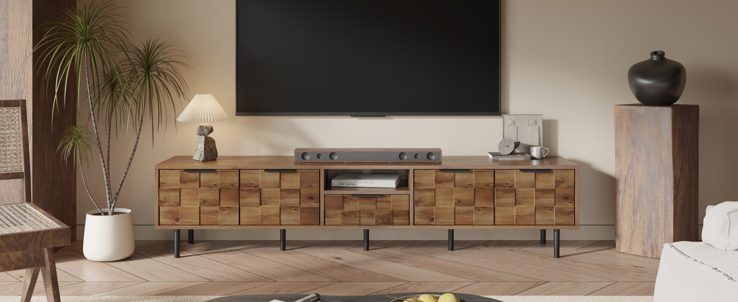 Upgrade your entertainment area with this stylish and functional TV console that combines a warm natural wood finish with modern checkered detailing and L-shaped handles. Thoughtfully designed for everyday living, it offers a variety of storage options, soft-closing hardware, and a sturdy build to support large TVs while keeping cables and accessories organized and out of sight.