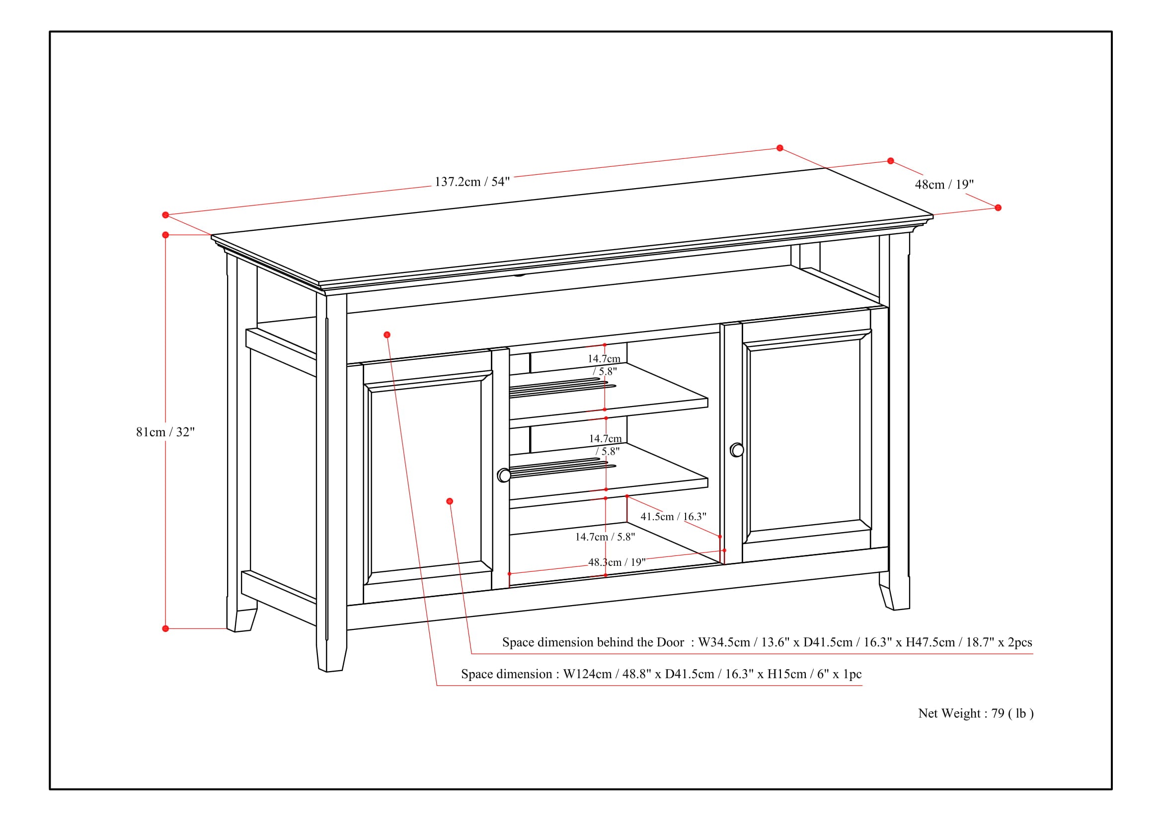 - Spacious layout: two side doors each reveal storage with an adjustable shelf, plus a central cabinet with two adjustable shelves and a top open shelf for cable boxes, consoles, or streaming devices.