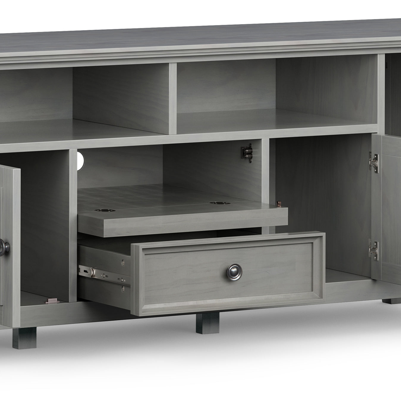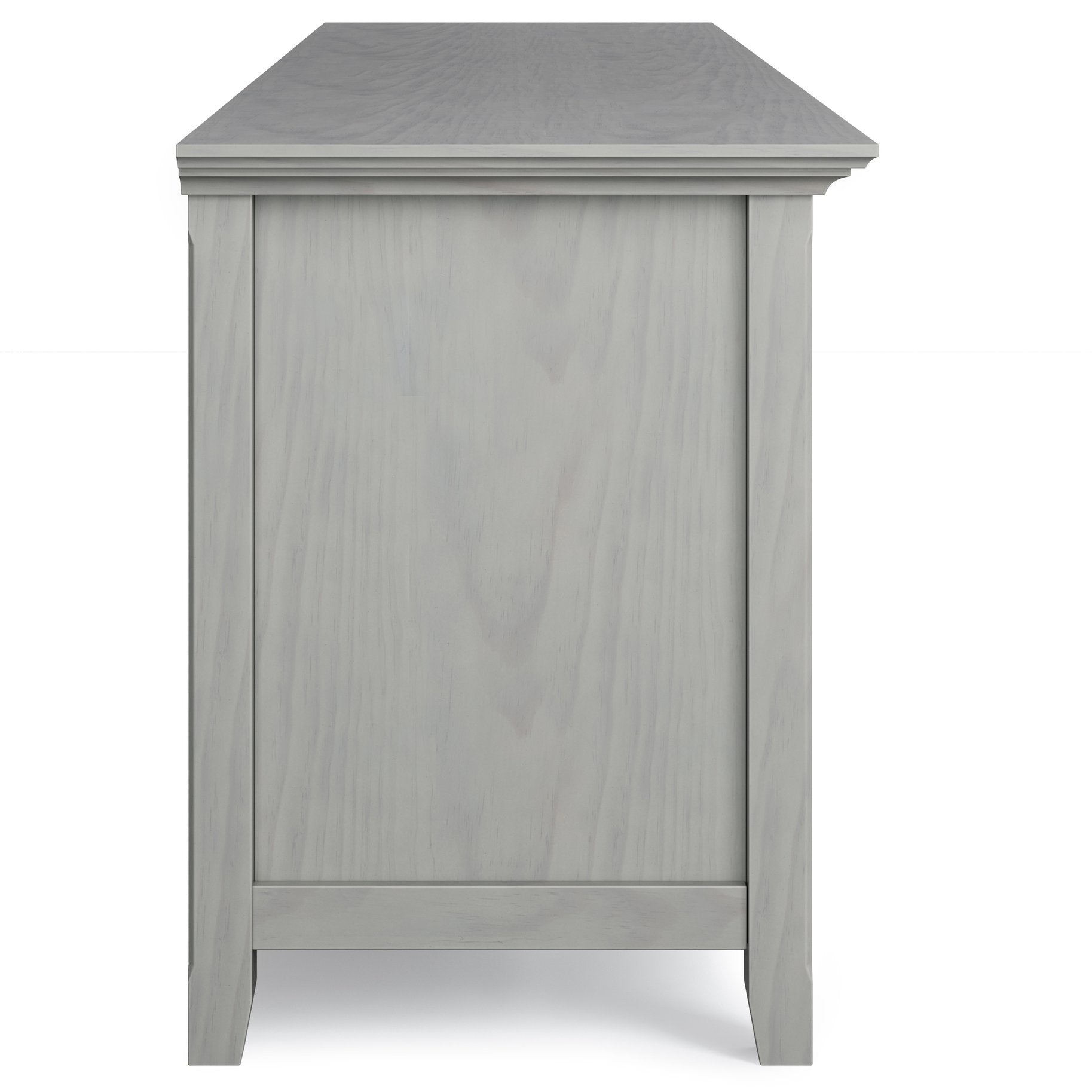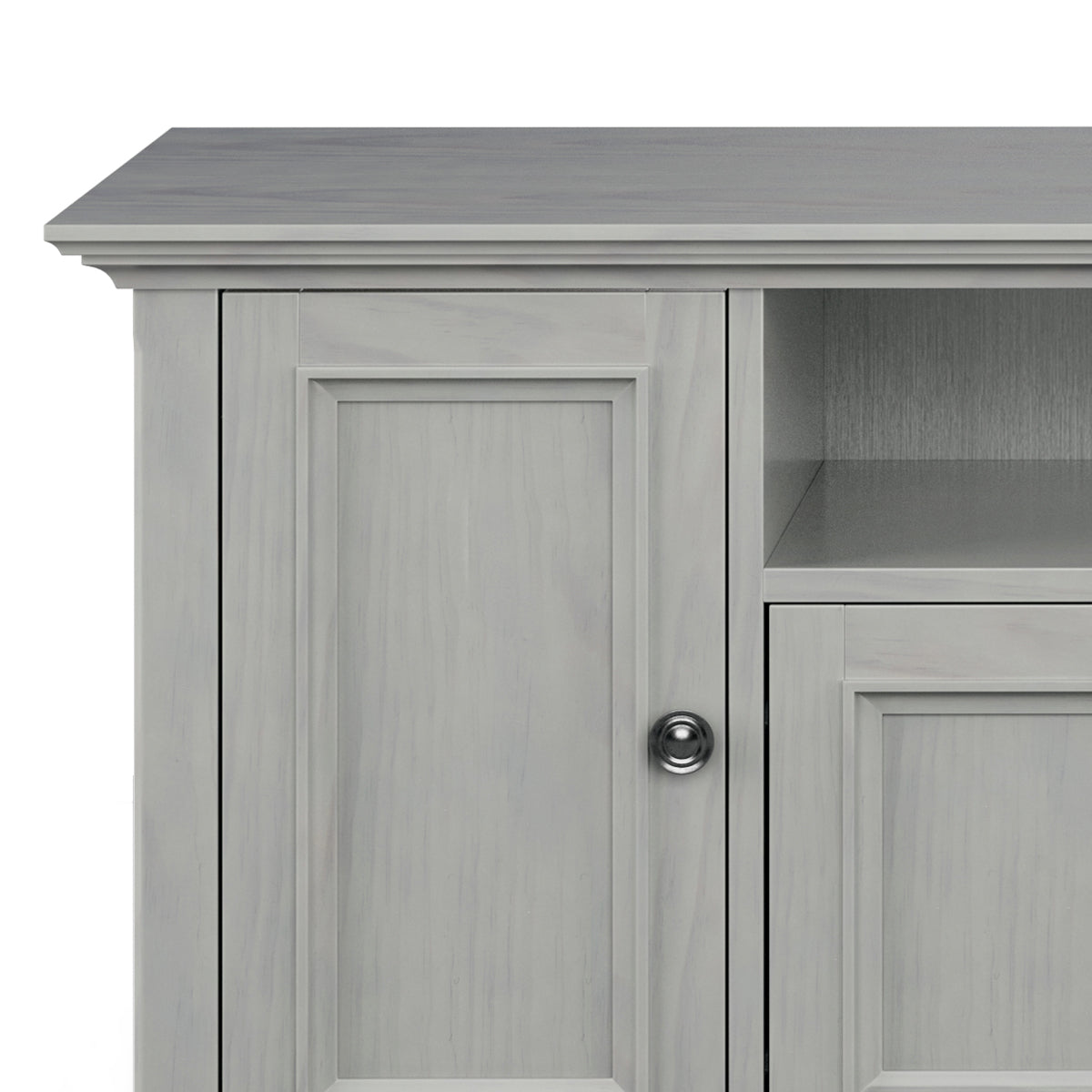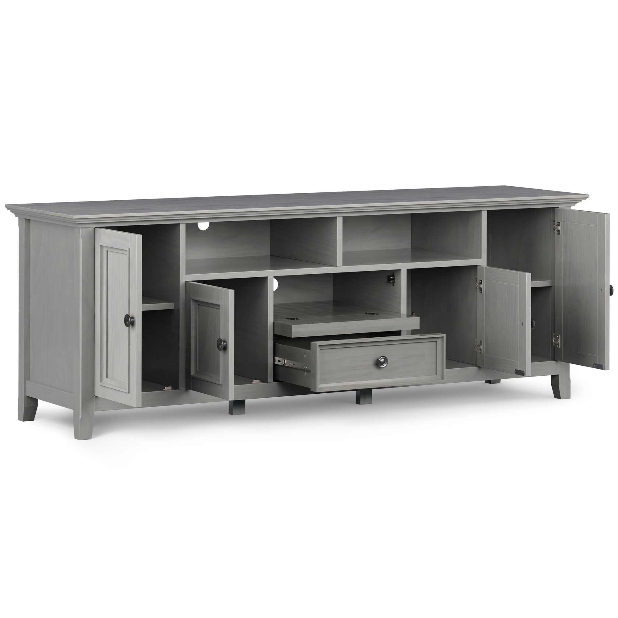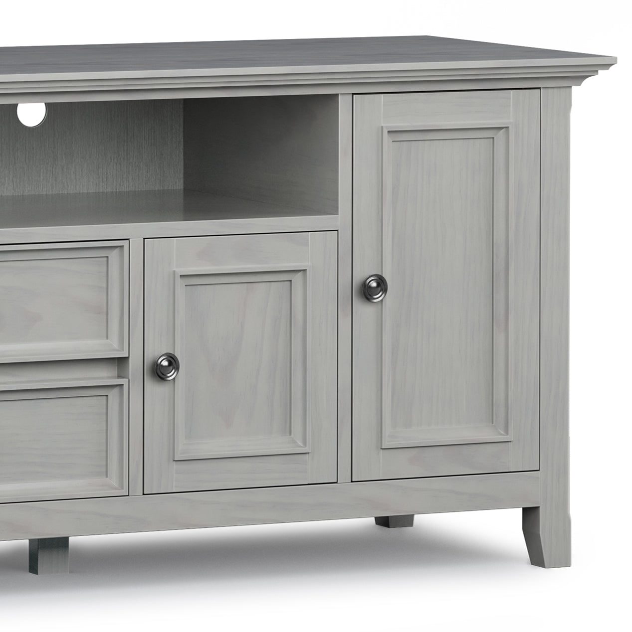 A beautifully crafted centerpiece for your living room, this solid wood TV media stand combines timeless transitional design with practical storage to keep your entertainment area organized and stylish. Hand-finished in a soft Fog Grey and detailed with tapered legs and antique-bronze hardware, it offers room for large TVs and thoughtful features that make setup and daily use simple and attractive.