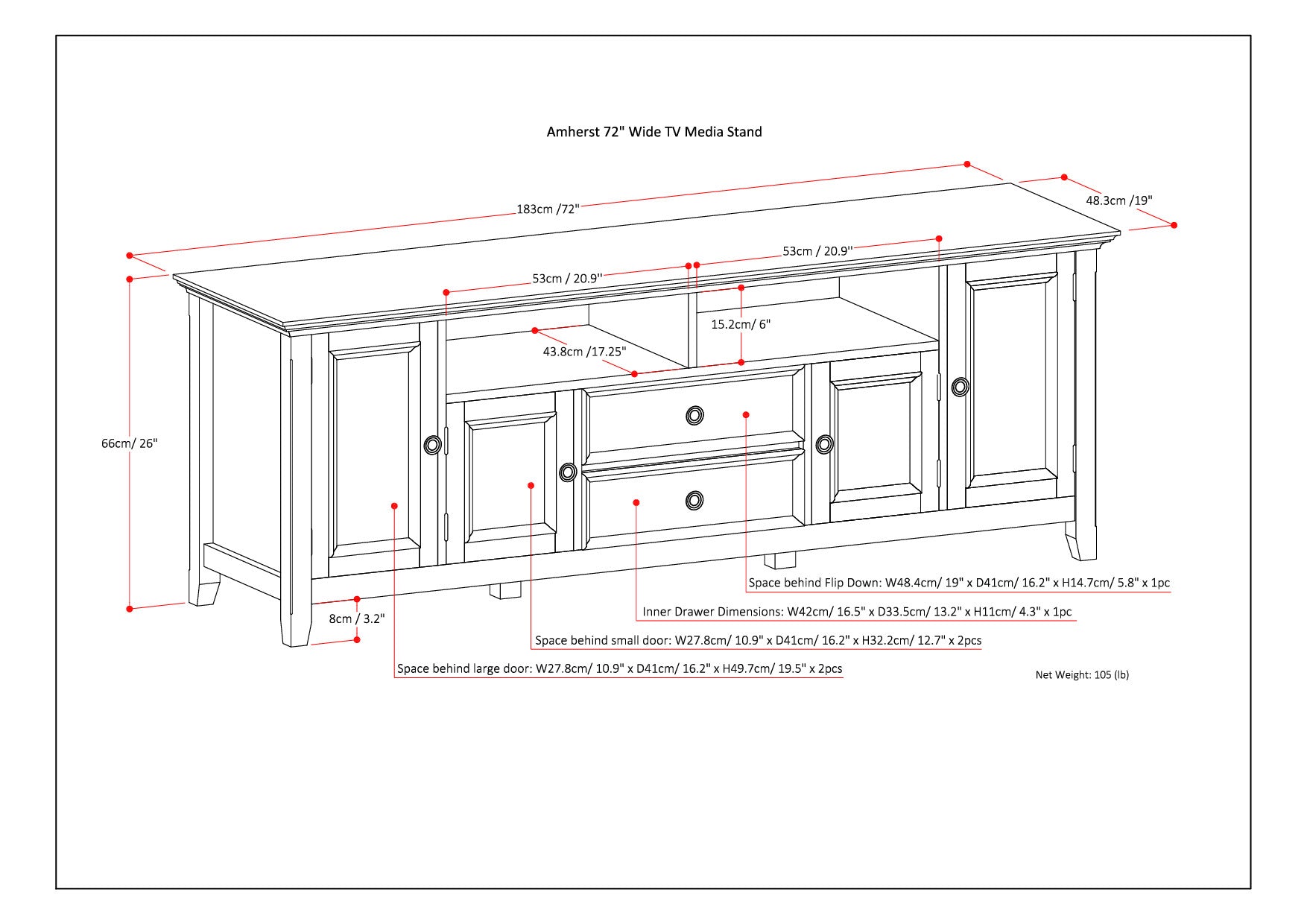 - Storage layout: large central open compartment plus two drawers and two framed doors; each of the two large side cabinets contains one adjustable shelf for flexible organization.