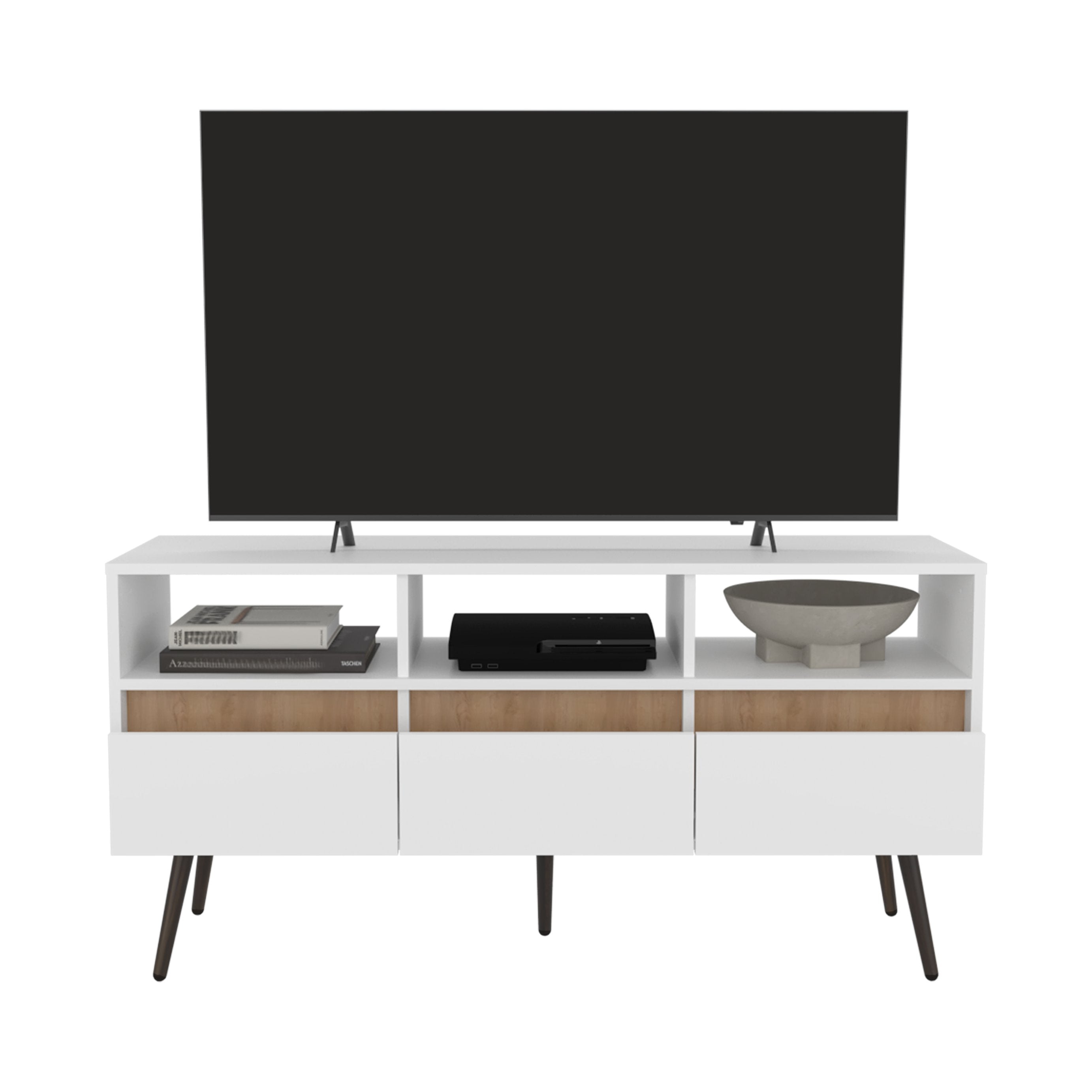 Bring contemporary style and practical organization to your living or TV room with this multi-finish media console. Thoughtfully designed for both display and hidden storage, it balances clean lines, open shelving, and three roomy drawers to keep remotes, cables, and media accessories neatly tucked away while supporting and showcasing your TV and devices.