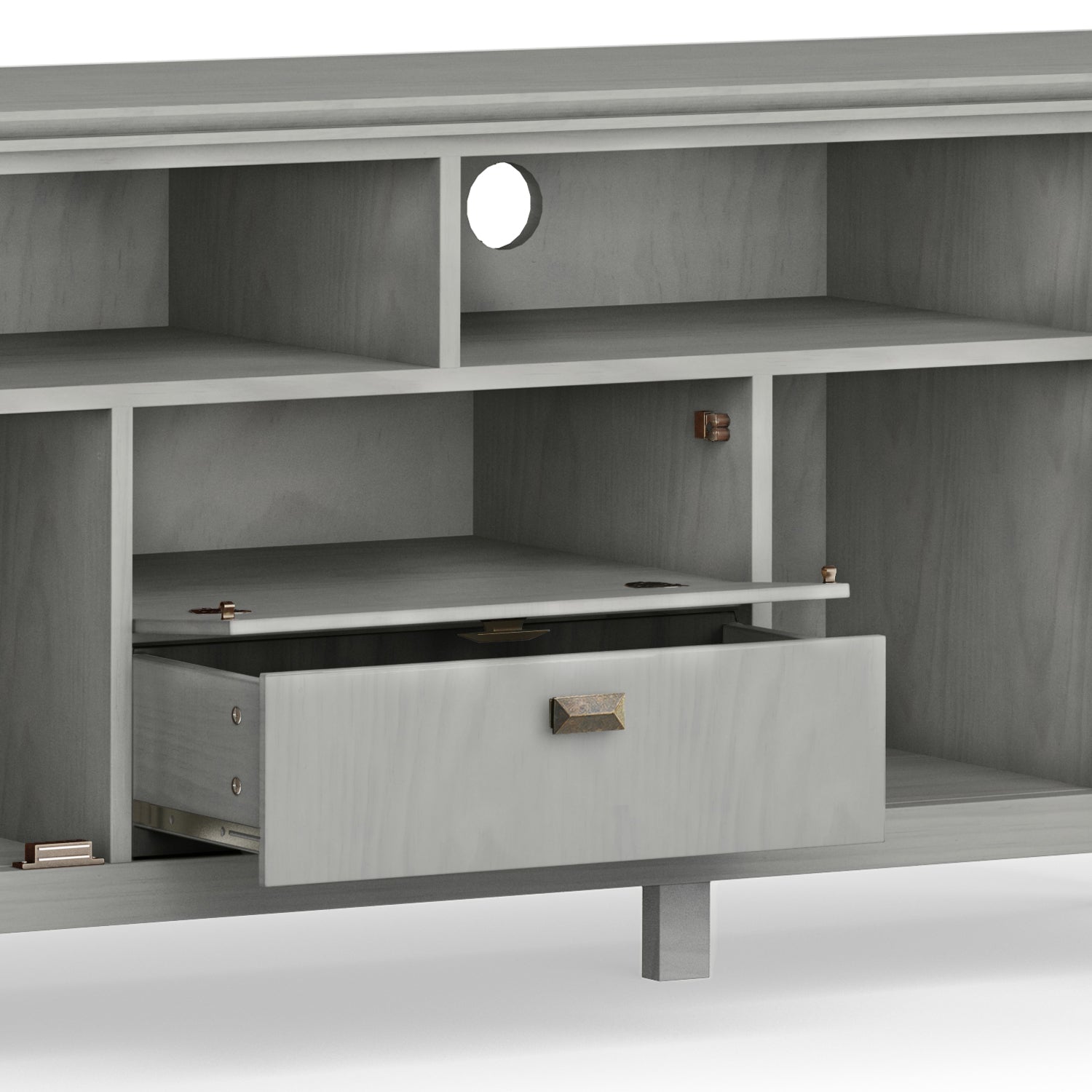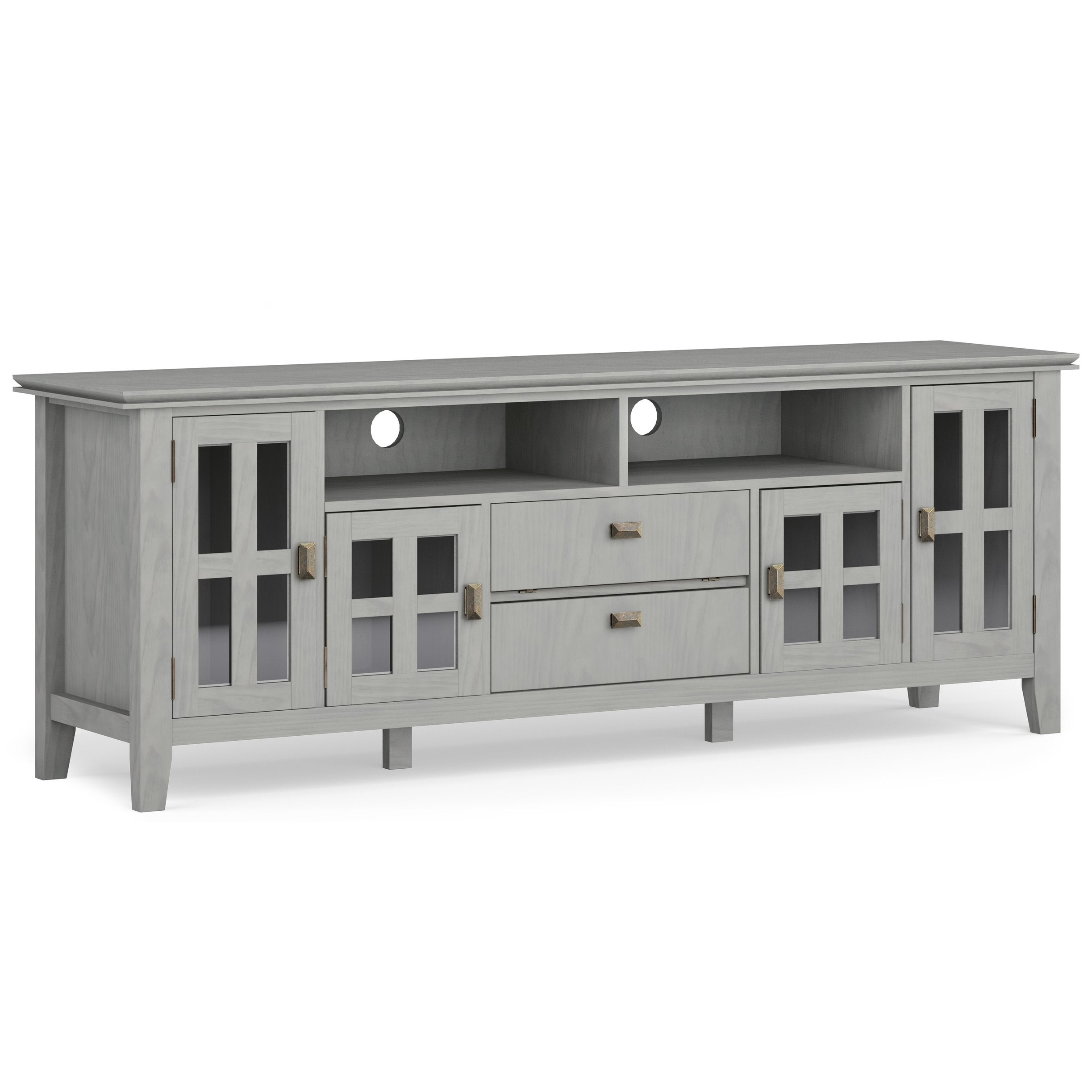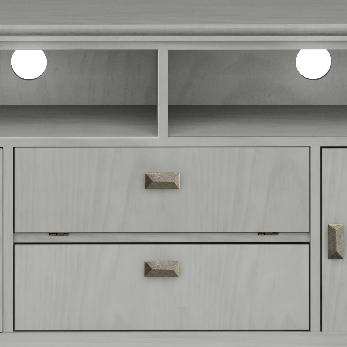Bring refined craftsmanship and versatile storage to your living room with this hand-finished Artisan TV media stand in Fog Grey. Designed to support large TVs while keeping components organized, its transitional-contemporary styling—clean angled edges, tapered legs, and antique-bronze hardware—fits both modern and classic interiors. Durable solid wood construction and a protective NC lacquer finish ensure lasting beauty and easy maintenance.