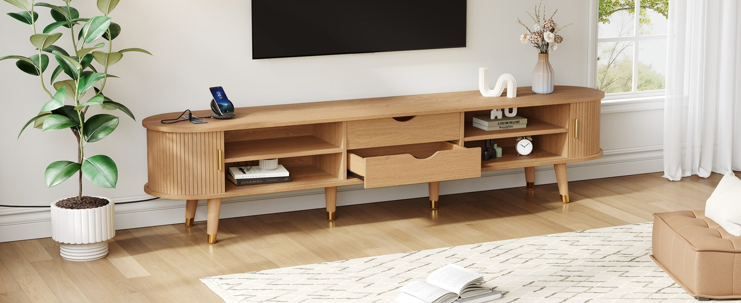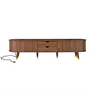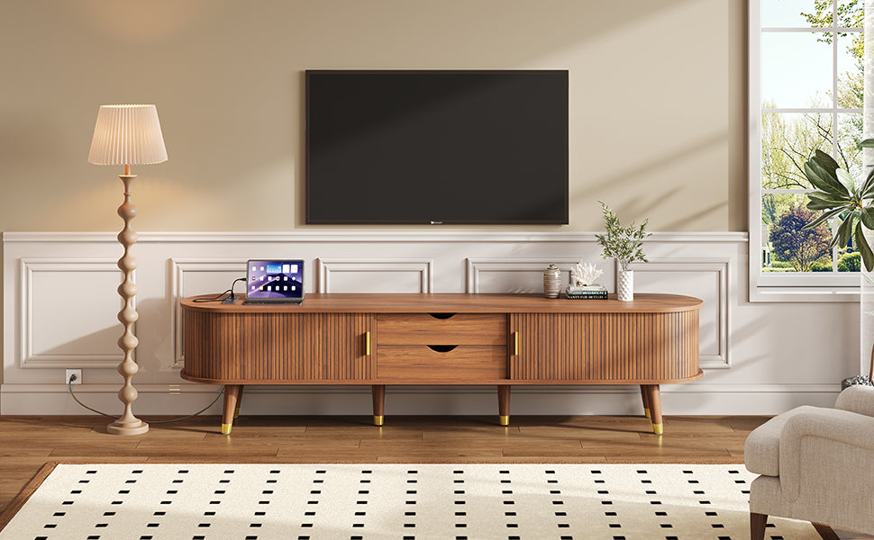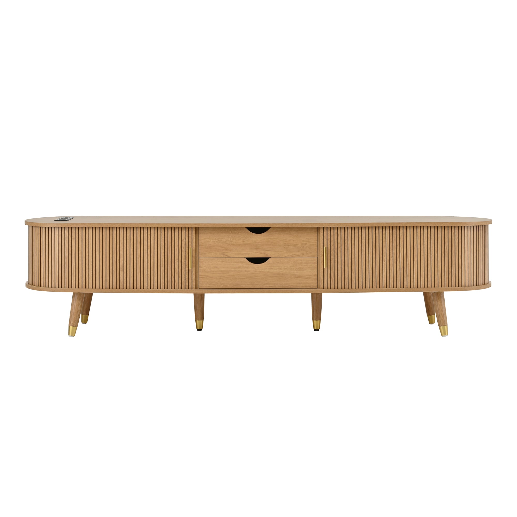 Elevate your living room with this mid-century inspired wooden TV console that blends refined details and practical features. Designed for TVs up to 80", the console’s fluted tambour sliding doors, oval tabletop, and gold-accented hardware create a warm, vintage-modern focal point while providing versatile storage and integrated charging for today’s entertainment needs.