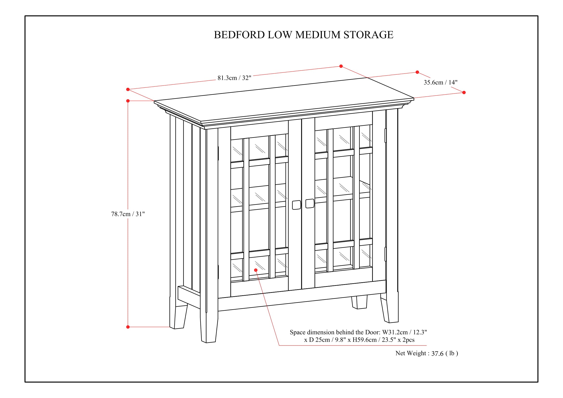 Bring timeless rustic charm and practical storage to any room with the Bedford low storage media cabinet. Handcrafted from solid wood and finished in a Rustic Natural Aged Brown stain, this compact cabinet pairs classic transitional details—molded top, cross-hatch mullioned tempered glass doors, and brushed nickel knobs—with versatile interior storage to keep media, books, or décor neatly organized.