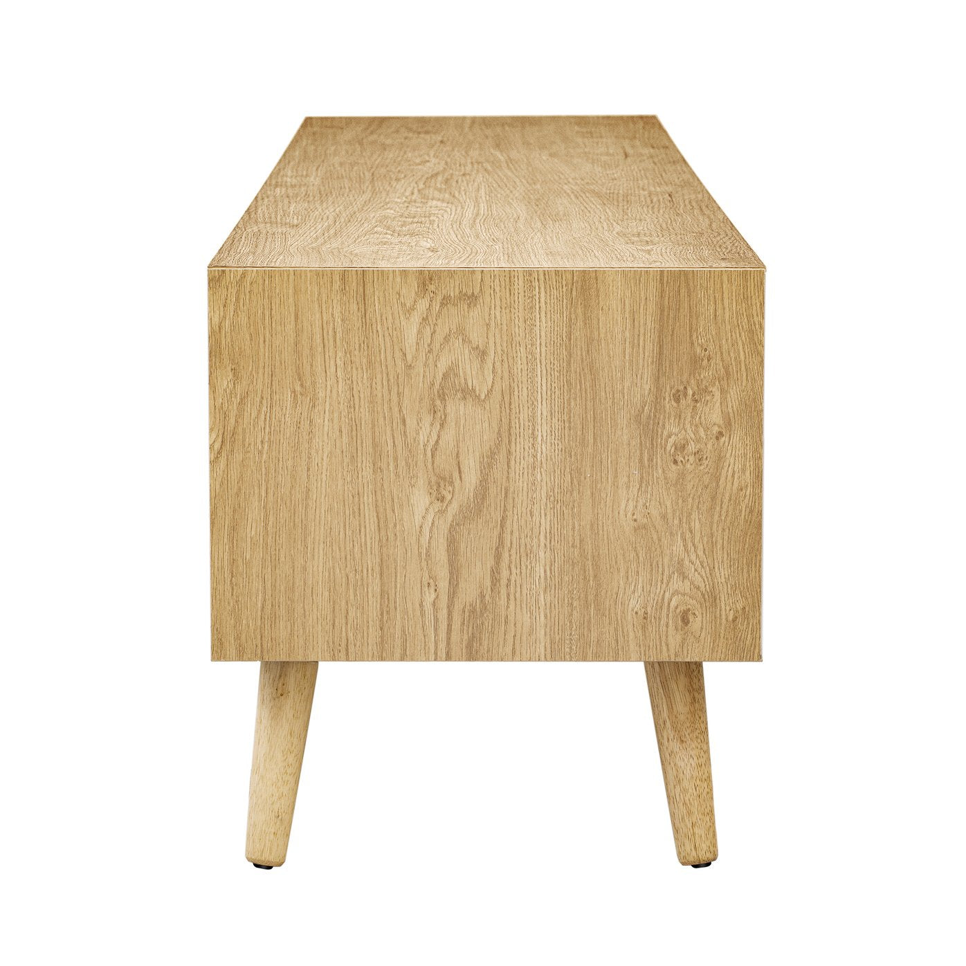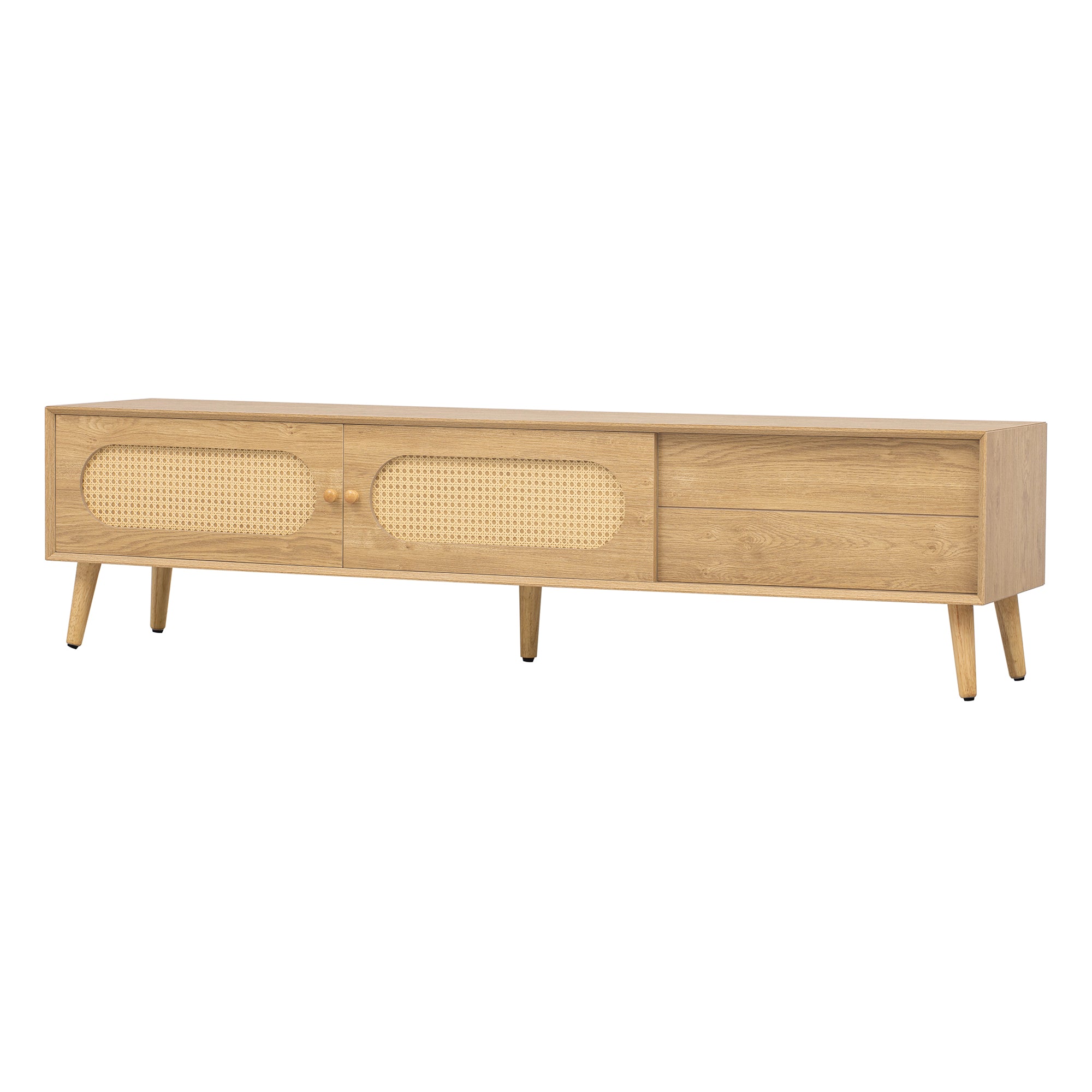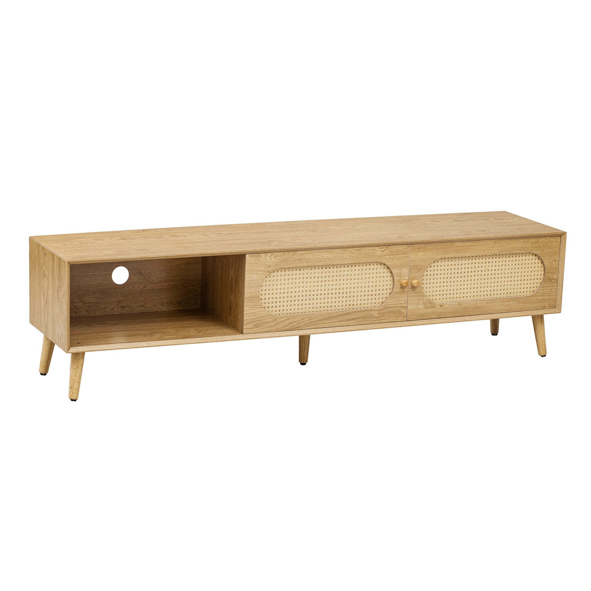 Bring relaxed Boho charm and modern farmhouse functionality to your living room with this rattan‑style TV cabinet. Thoughtfully crafted from durable MDF with solid wood legs, it blends natural texture and sturdy construction while offering versatile storage and tidy cable management for TVs up to 80".