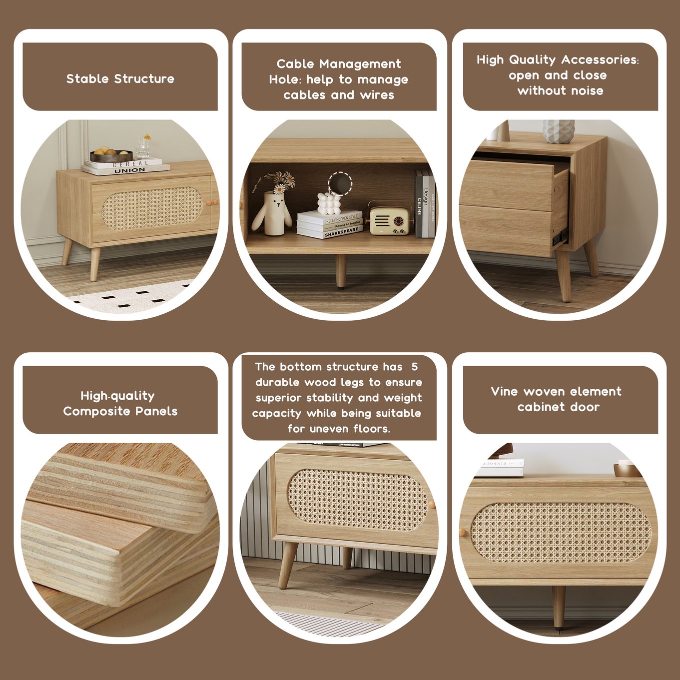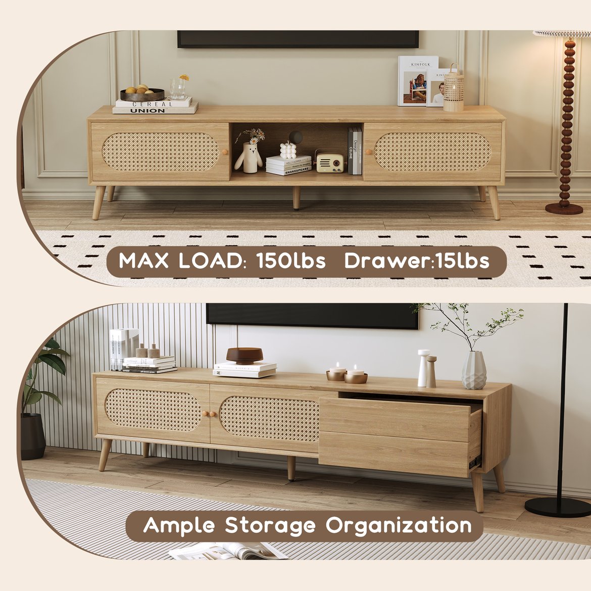 - [Farmhouse Rattan TV Cabinet] The wooden TV cabinet combines classic and modern, with farmhouse-style rattan decoration, bringing a brand new visual effect. The longer desktop can accommodate 80-inch TV.