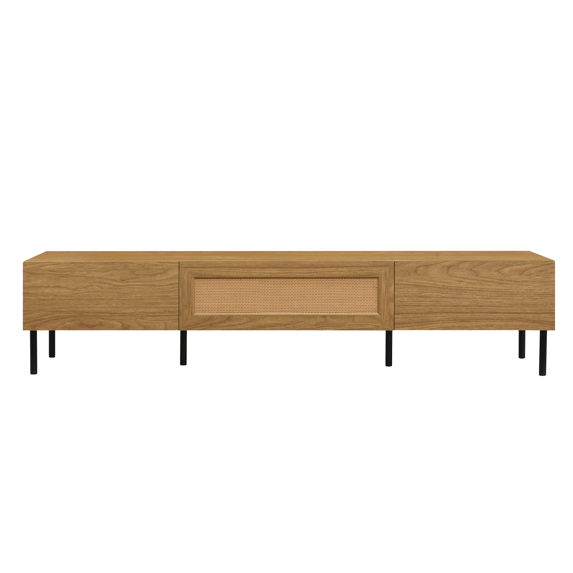 Bring warm, relaxed boho charm to your living room with this Modern Farmhouse TV stand. Designed for TVs up to 80", the console blends rattan-inspired detailing with a durable particle-board body and metal legs for a stylish yet sturdy entertainment center. Its thoughtful storage layout and solid hardware keep media components organized while the open and closed compartments let you display décor or hide clutter for a clean, modern look.