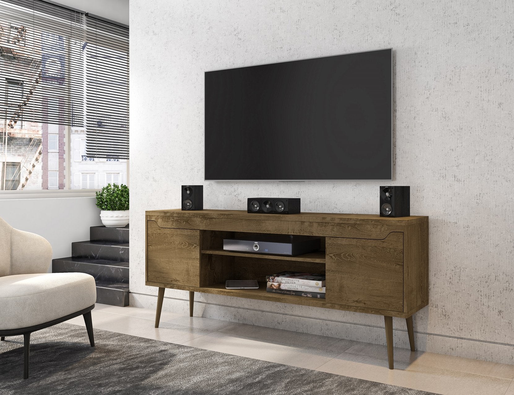 Give your living room a warm, modern update with this rustic brown TV stand—designed to combine mid-century charm with practical media storage. Thoughtfully built for everyday use, it balances open shelving and hidden compartments to keep devices organized while maintaining a clean, stylish silhouette that complements a range of decors.