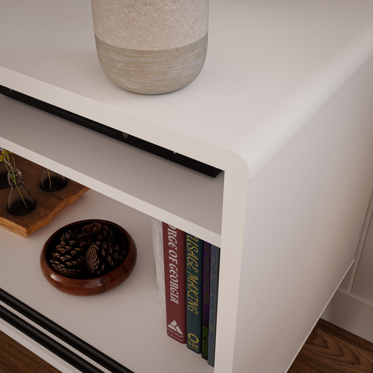 - Storage: Sliding doors conceal electronics and accessories to maintain a tidy appearance
