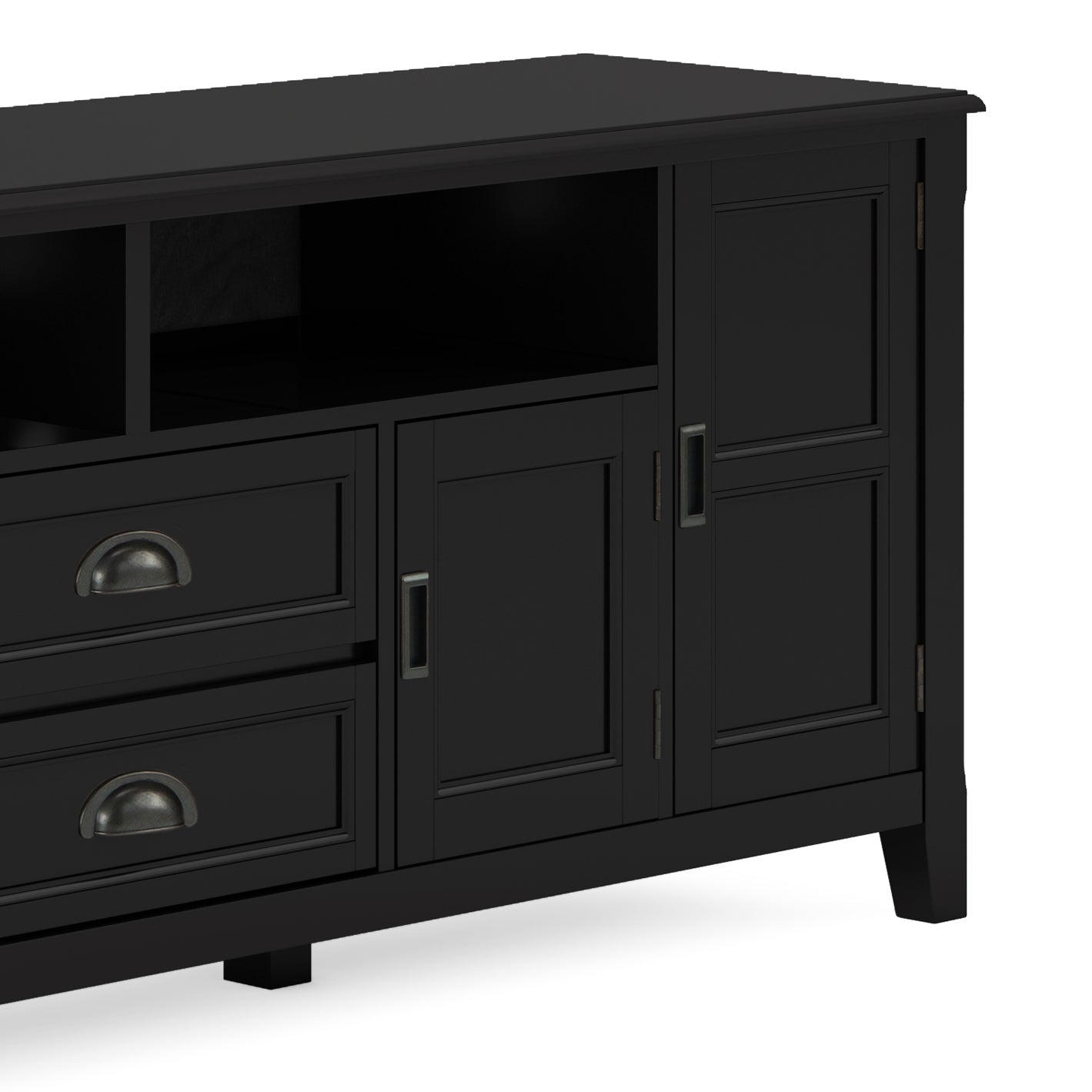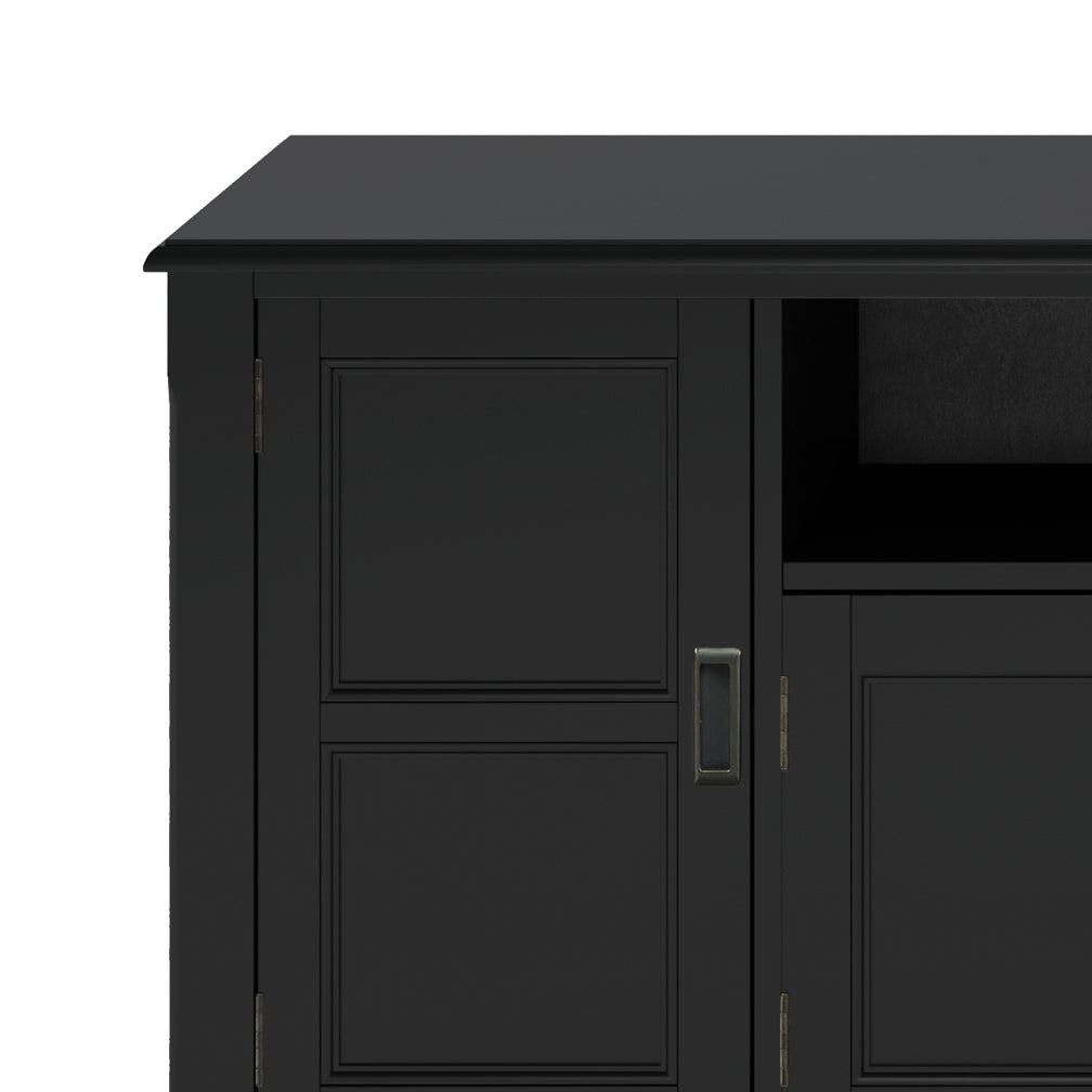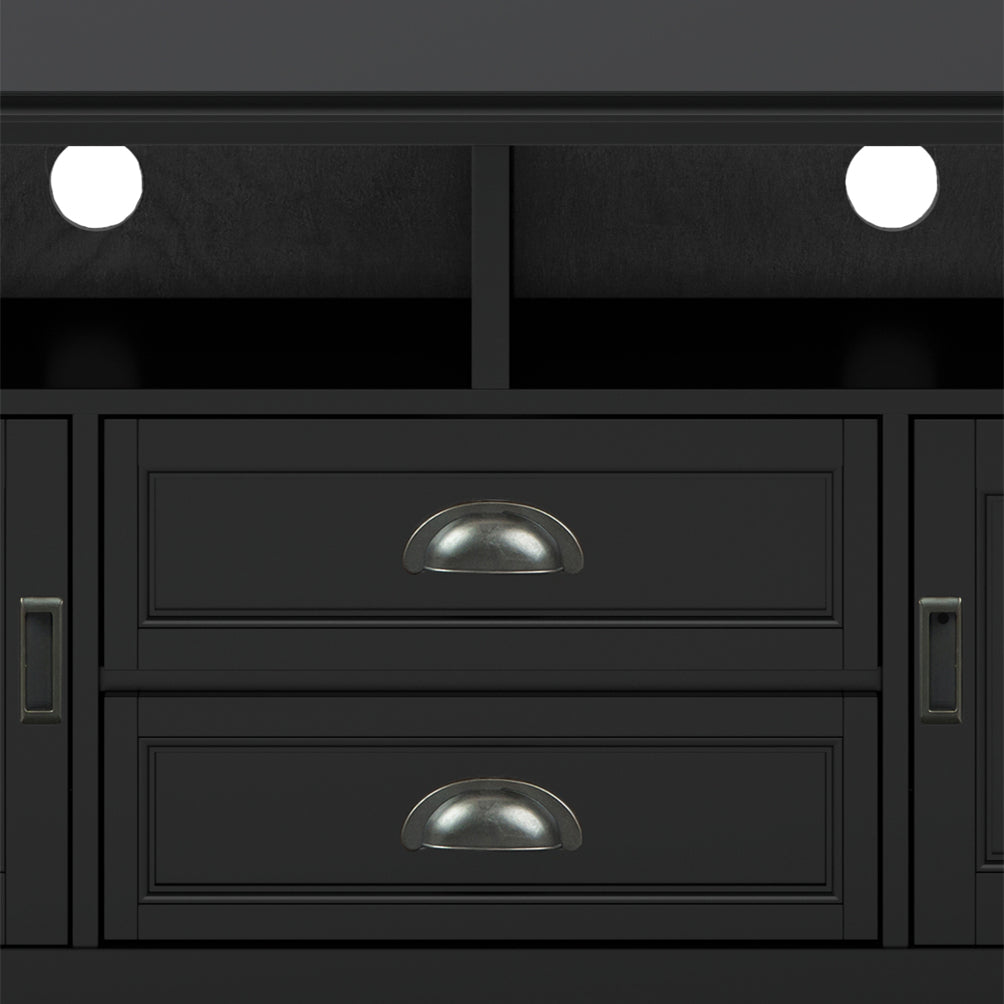 Give your living room a refined focal point with this handcrafted Burlington media stand. Built from solid wood and finished in rich black with a protective NC lacquer, it combines classic transitional styling with practical storage and cord management to keep your entertainment area neat and elegant.