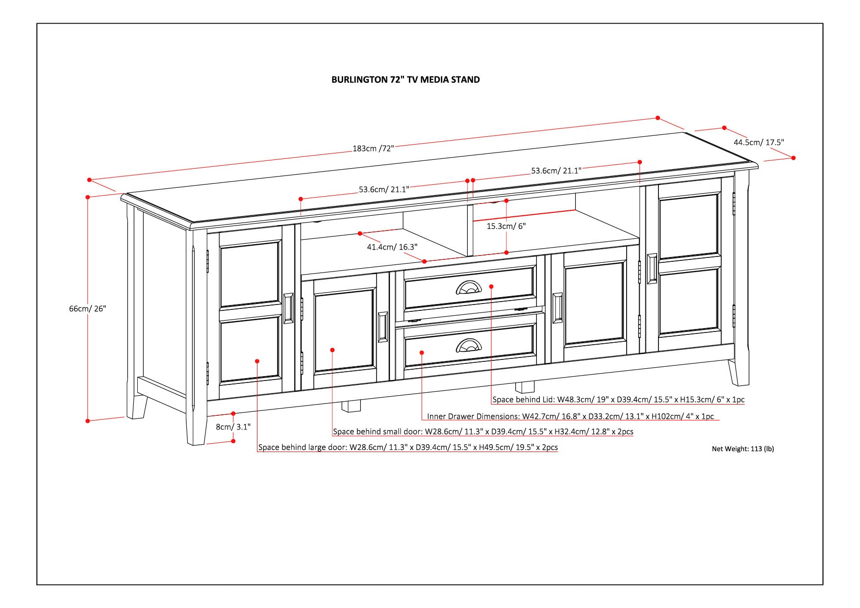- Dimensions: 17.5" D x 72" W x 26" H