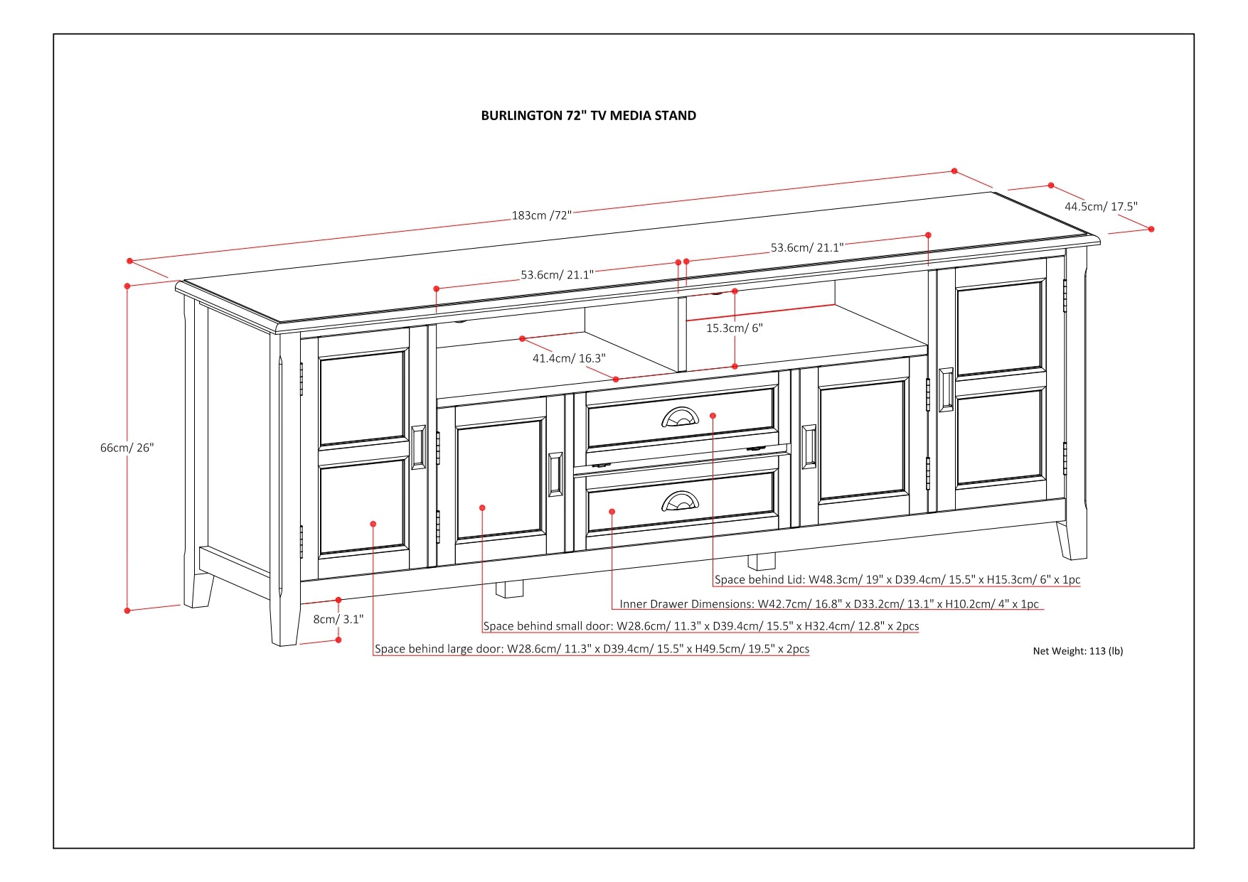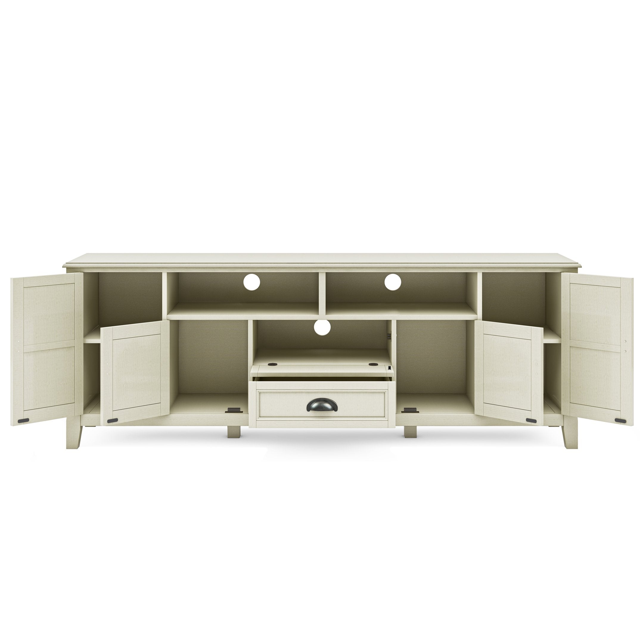 Give your living room a timeless anchor with the Burlington TV media stand — a handcrafted, transitional piece that blends classic detailing with modern functionality. Finished in an Antique White with subtle distressing, this extra-wide stand accommodates large TVs while keeping media components, cords, and accessories neatly organized.