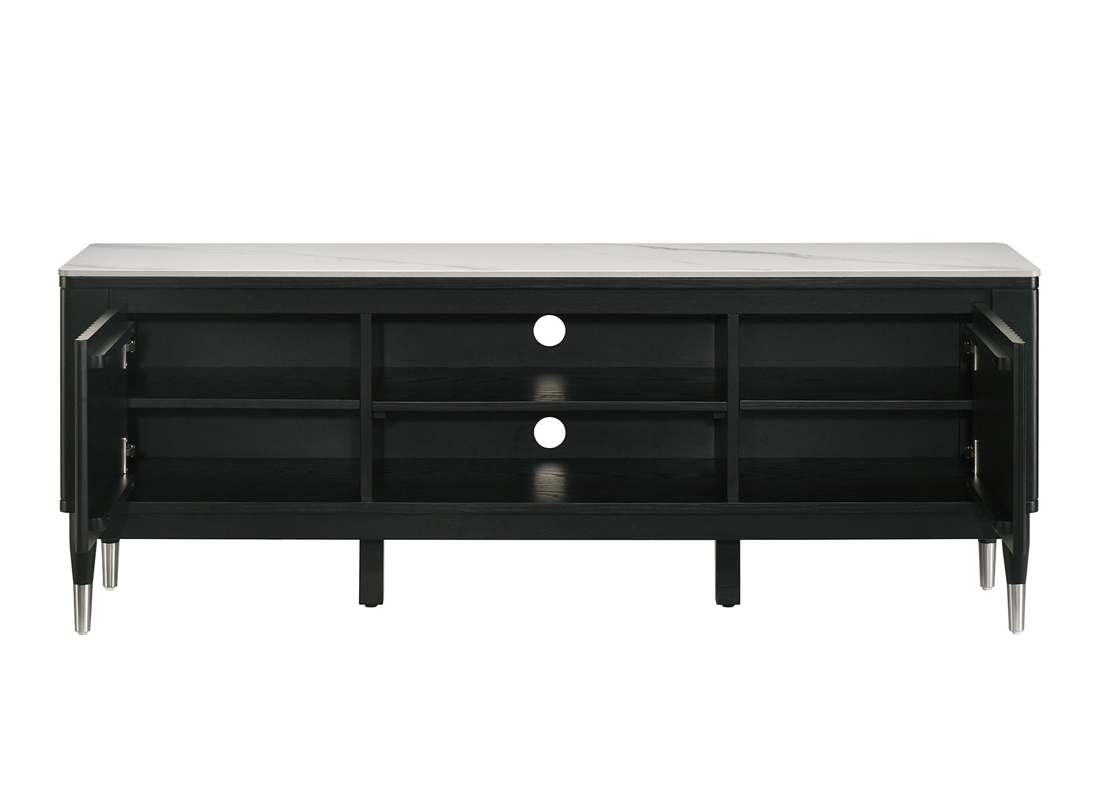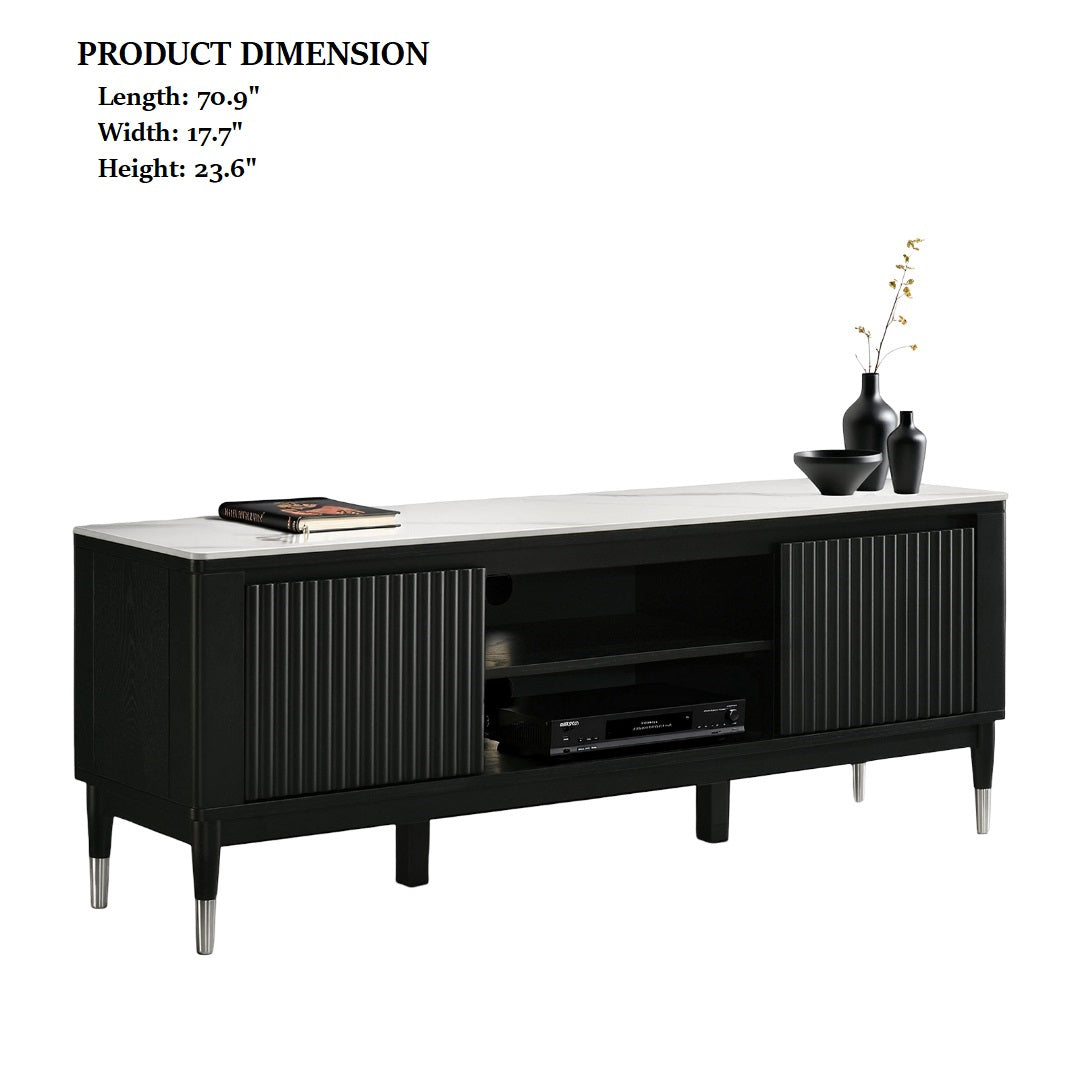 Elevate your living room with a sleek, contemporary TV console that combines striking materials and thoughtful storage for modern entertainment setups. This console pairs a durable sintered stone top with silver-capped arrow legs and an open-shelf design to showcase media components while keeping the overall look light and architectural.