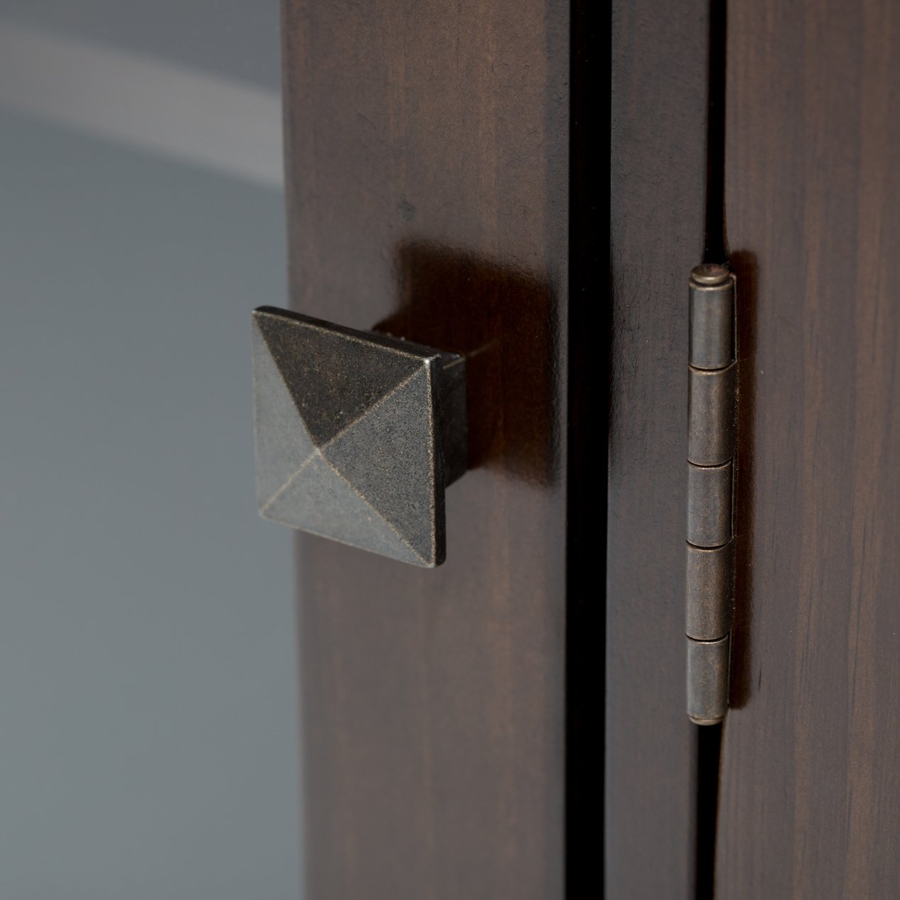 - Design Details: Contemporary floating square-edged top, square bronze-finish knobs, and square tapered legs