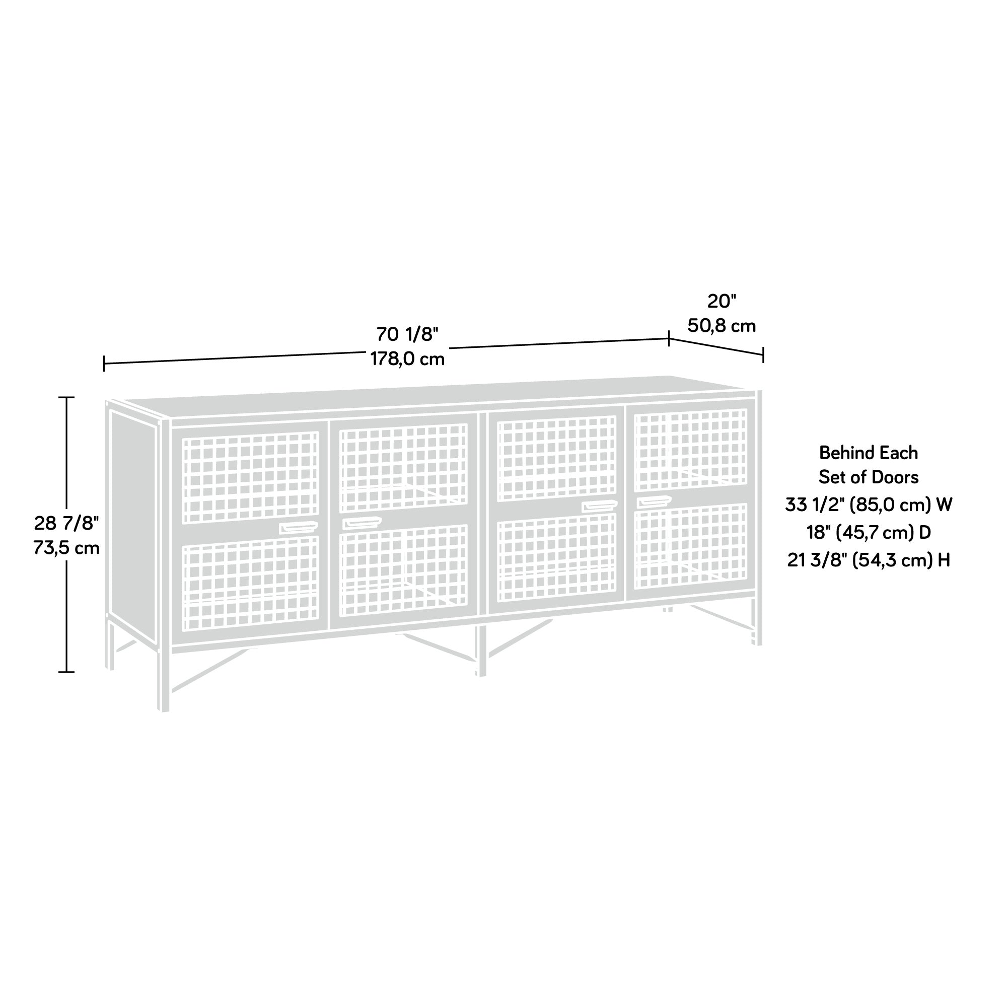 - Large adjustable shelf behind each set of metal doors with wire mesh front for flexible storage options