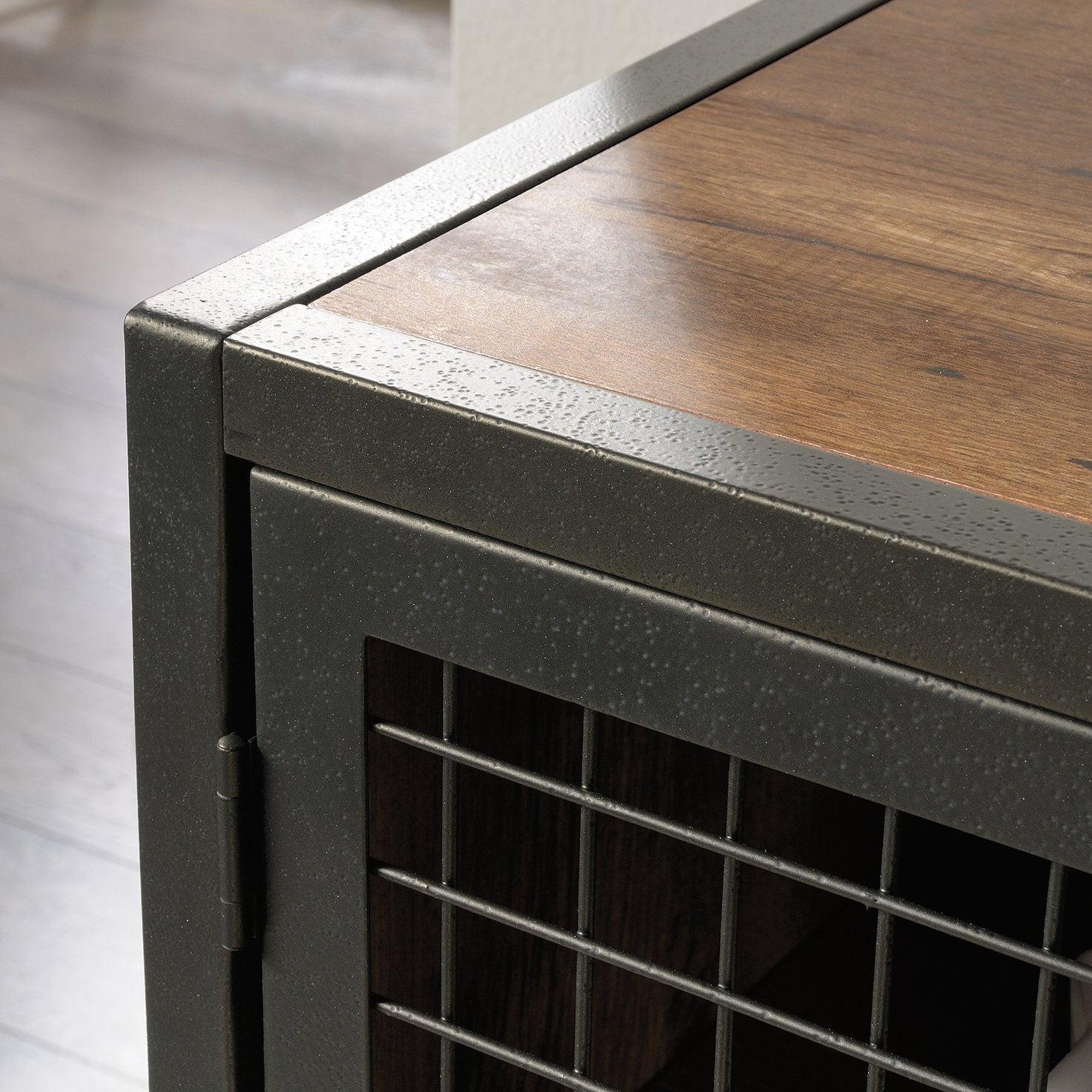 - Door Design: Metal doors with wire mesh fronts provide ventilation for electronics while adding an industrial aesthetic