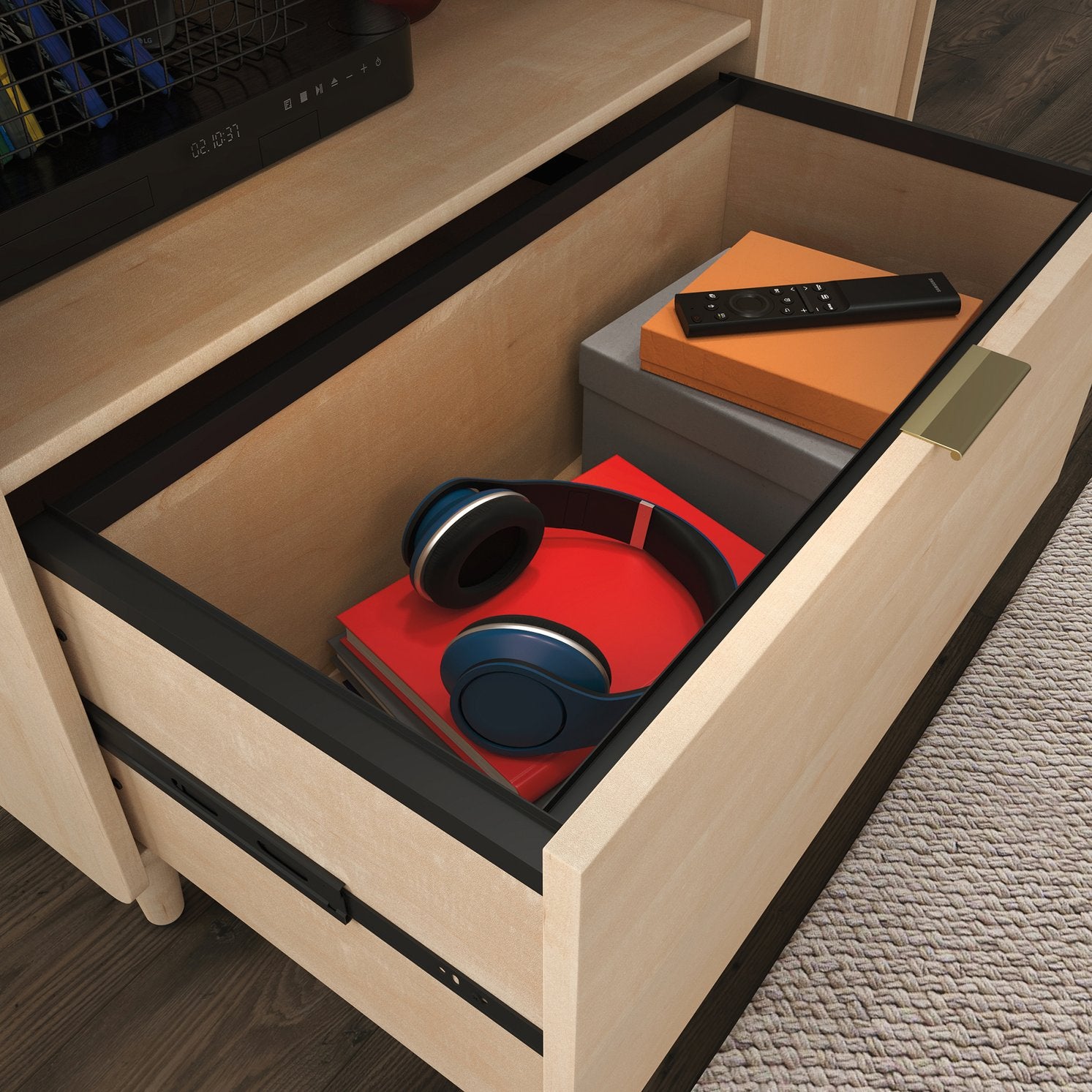 - Storage layout: Combination of open shelving for media devices and concealed compartments with adjustable shelving to customize storage