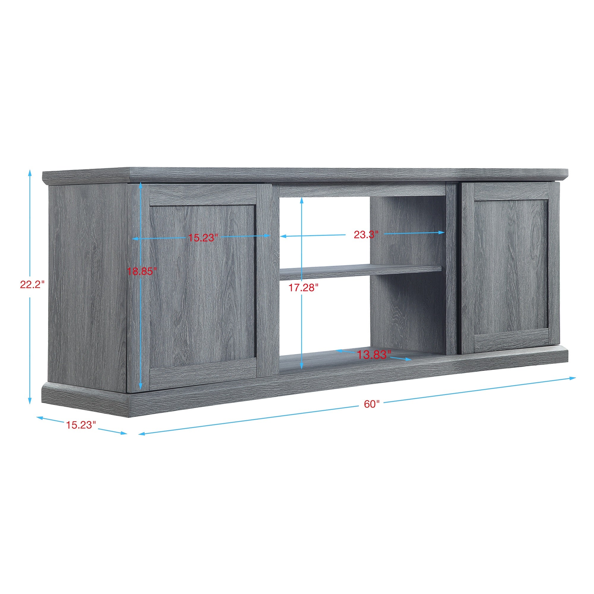 - Upon assembly, TV Stand Dimensions Measure: 60 in. Length, 22 in. Height, 15 in. Depth.