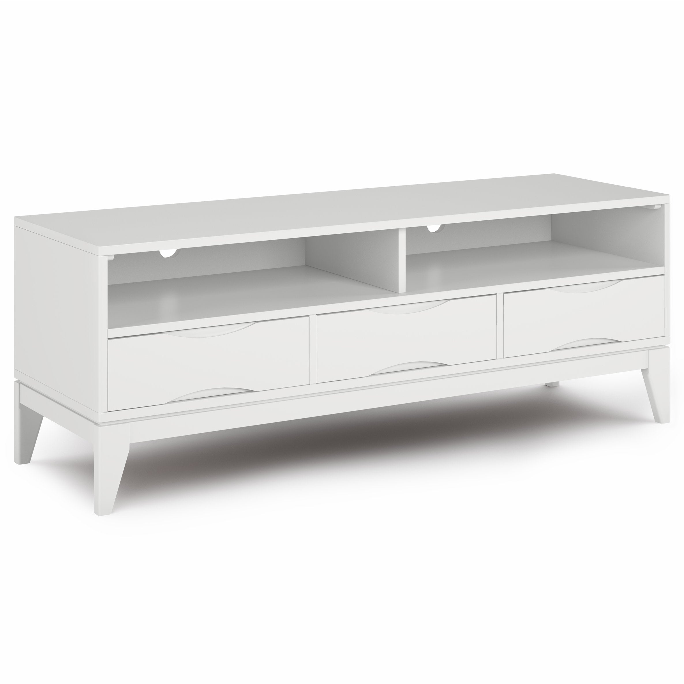 - Storage Layout: Three large drawers with notched handles plus two spacious open compartments for receivers, gaming consoles, or decorative items.