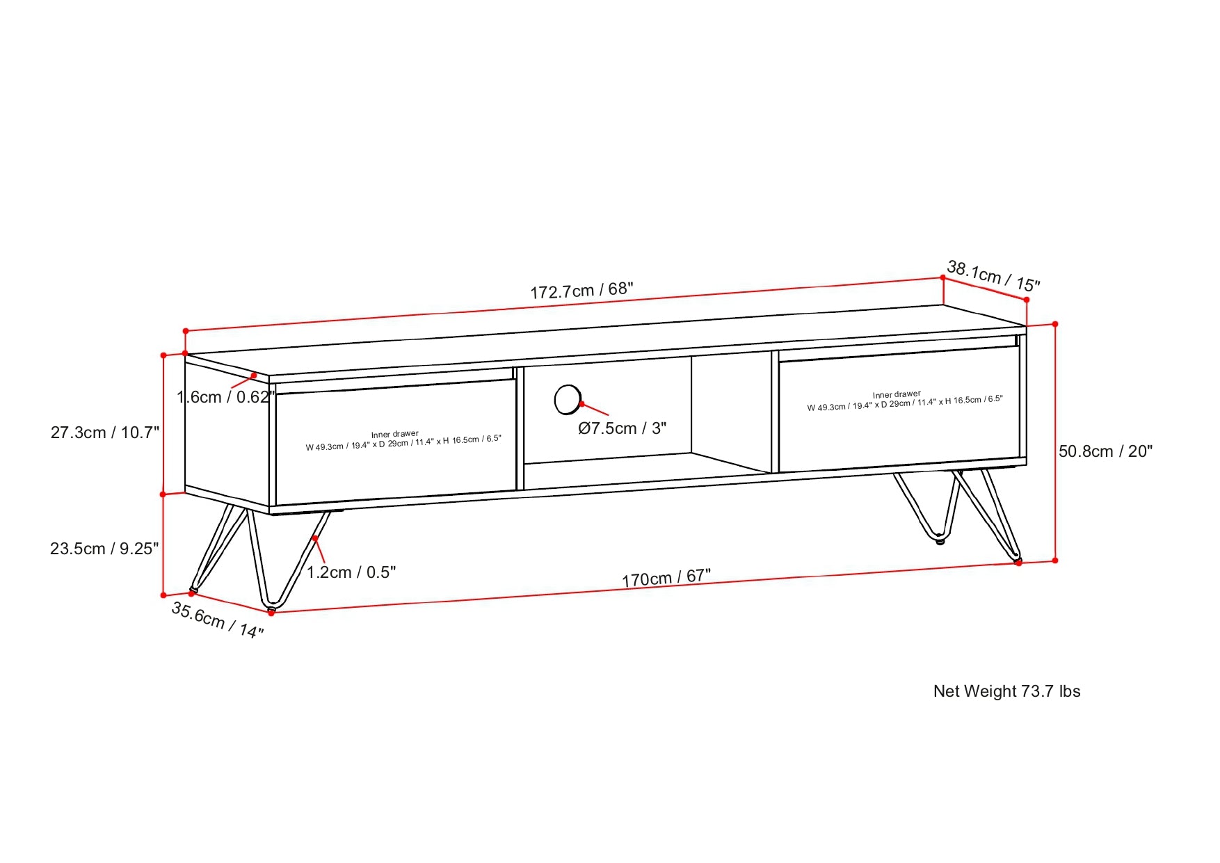 - Storage: Two side drawers with soft-close hinges and one open central compartment for media components, consoles, or décor.