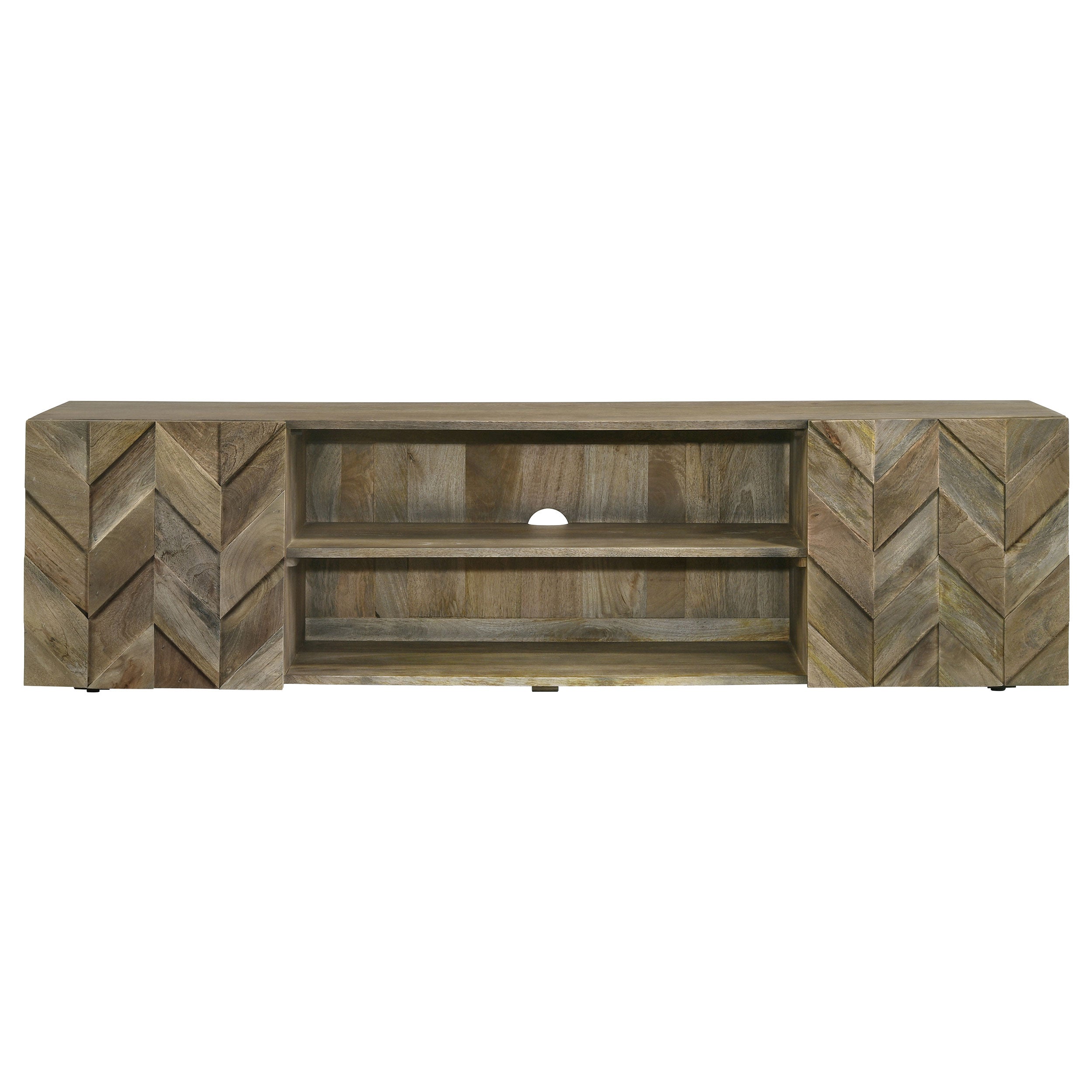 - The 70-inch TV stand features a striking herringbone pattern that adds sophisticated textural depth and visual interest to any room