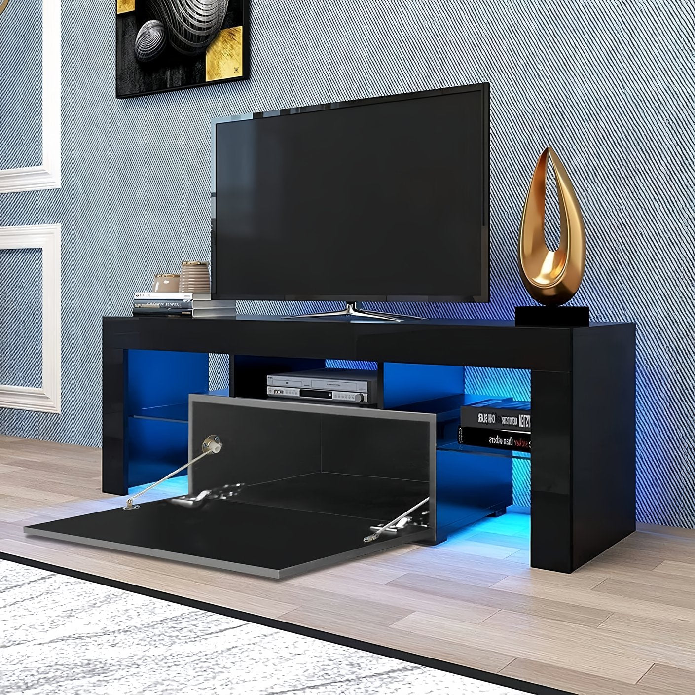 Bring modern style and practical storage to your living room or bedroom with this sleek LED TV stand. Designed for TVs up to 55 inches, it combines high-gloss UV finishes, a glass shelf for display or media devices, a lower flip-down door for concealed storage, and adjustable LED lighting to set the mood.