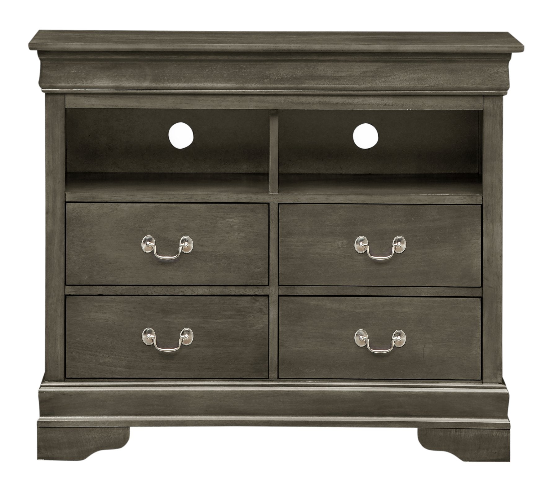 Give your bedroom a timeless, polished look with this traditional-style media chest. Crafted from durable particle board and detailed with carved bases and curved moldings, it combines classic design with practical storage—ideal for organizing clothing and keeping media components tidy. The neutral gray finish complements a variety of decor schemes while metal hardware and reinforced drawer construction ensure long-lasting performance.