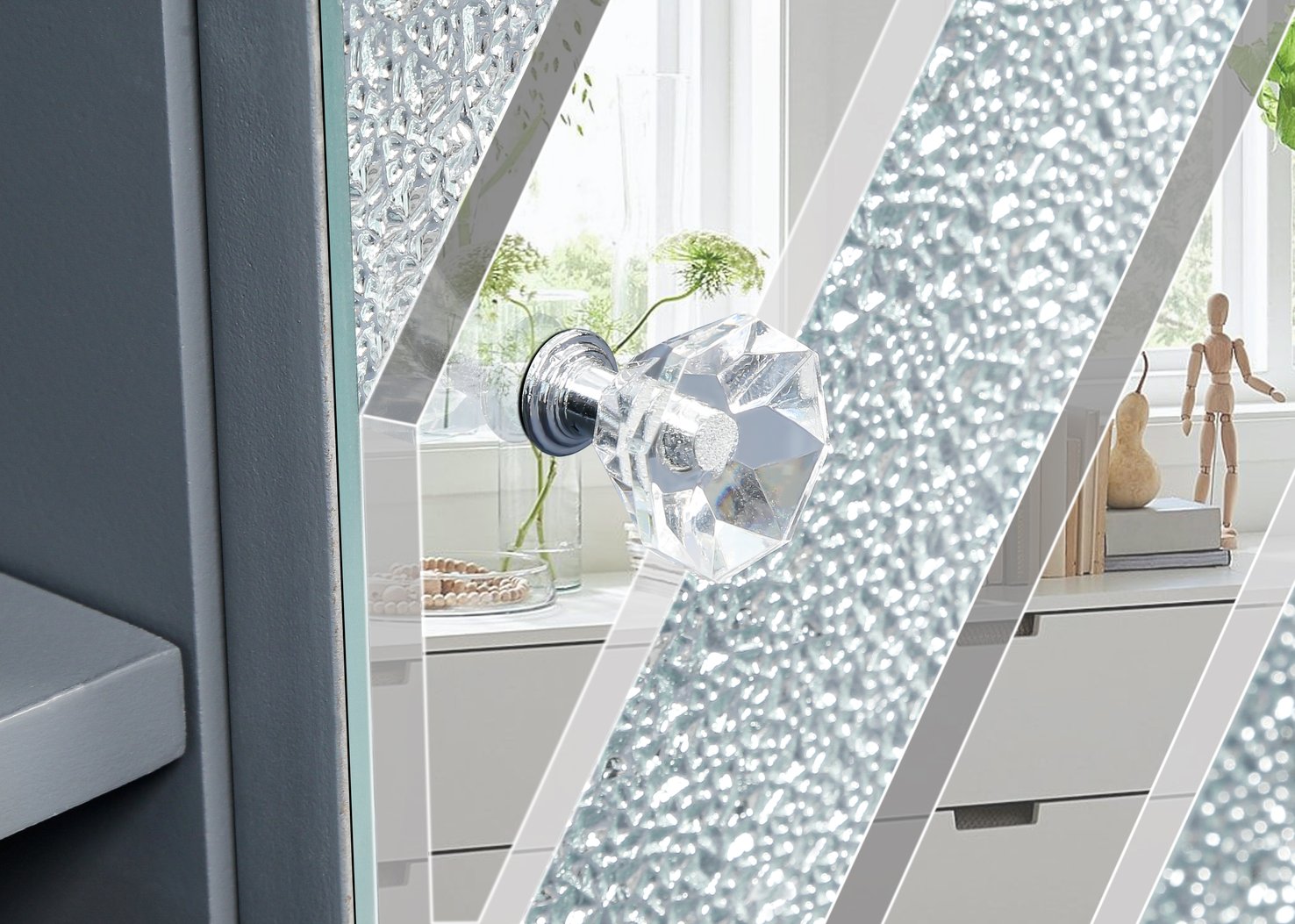 - Stylish mirrored doors: M-shaped sparkling mirror design on cabinet doors with brushed steel knobs for a contemporary, upscale look.