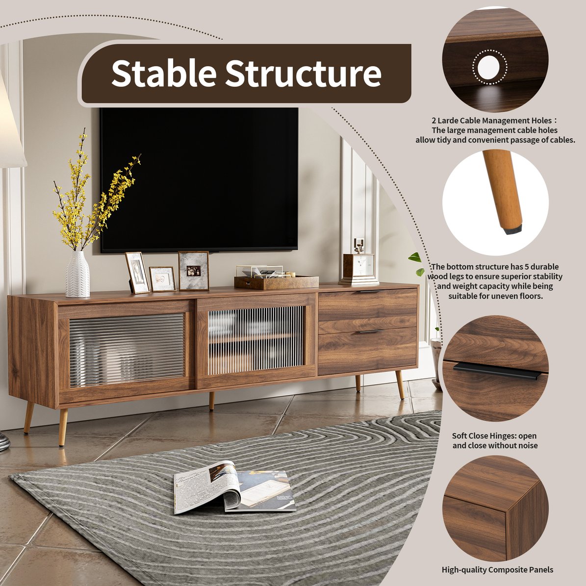 - Materials & finish: High-quality MDF cabinet with a walnut veneer finish and solid wood legs for stable support and natural wood grain appeal.