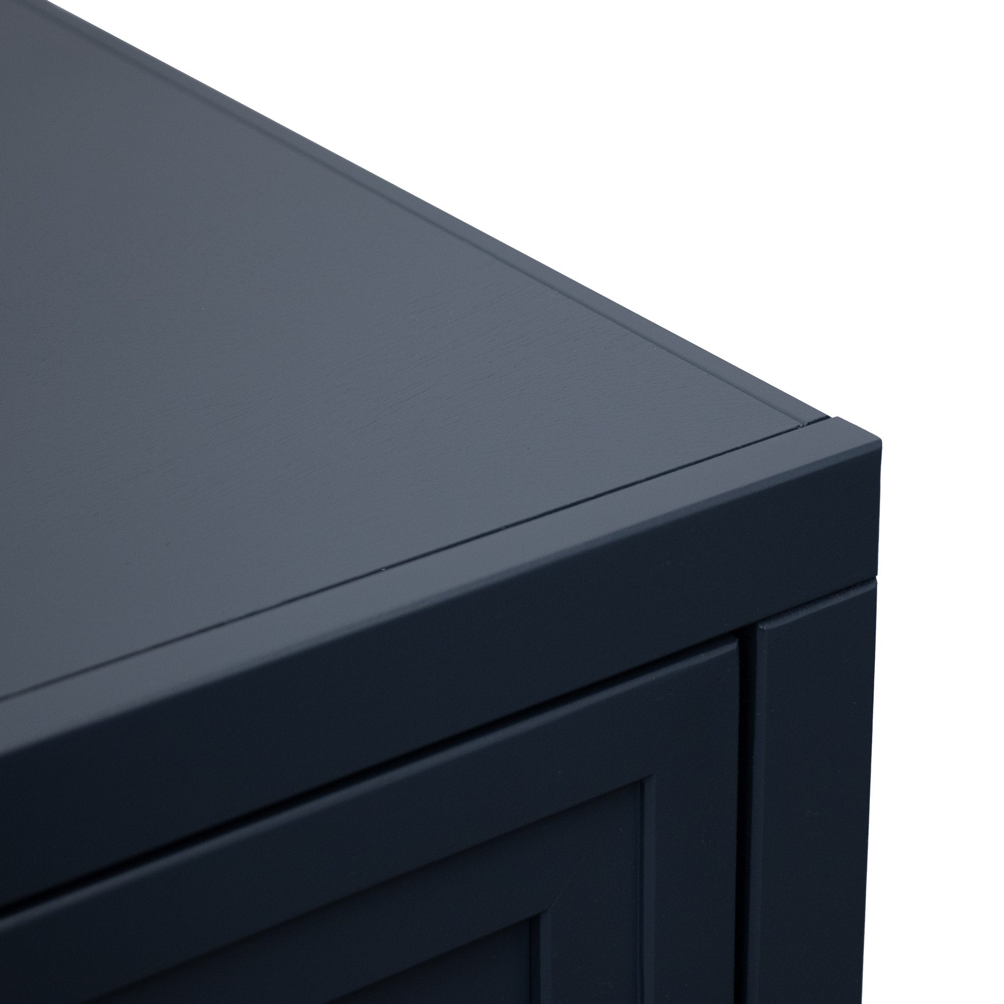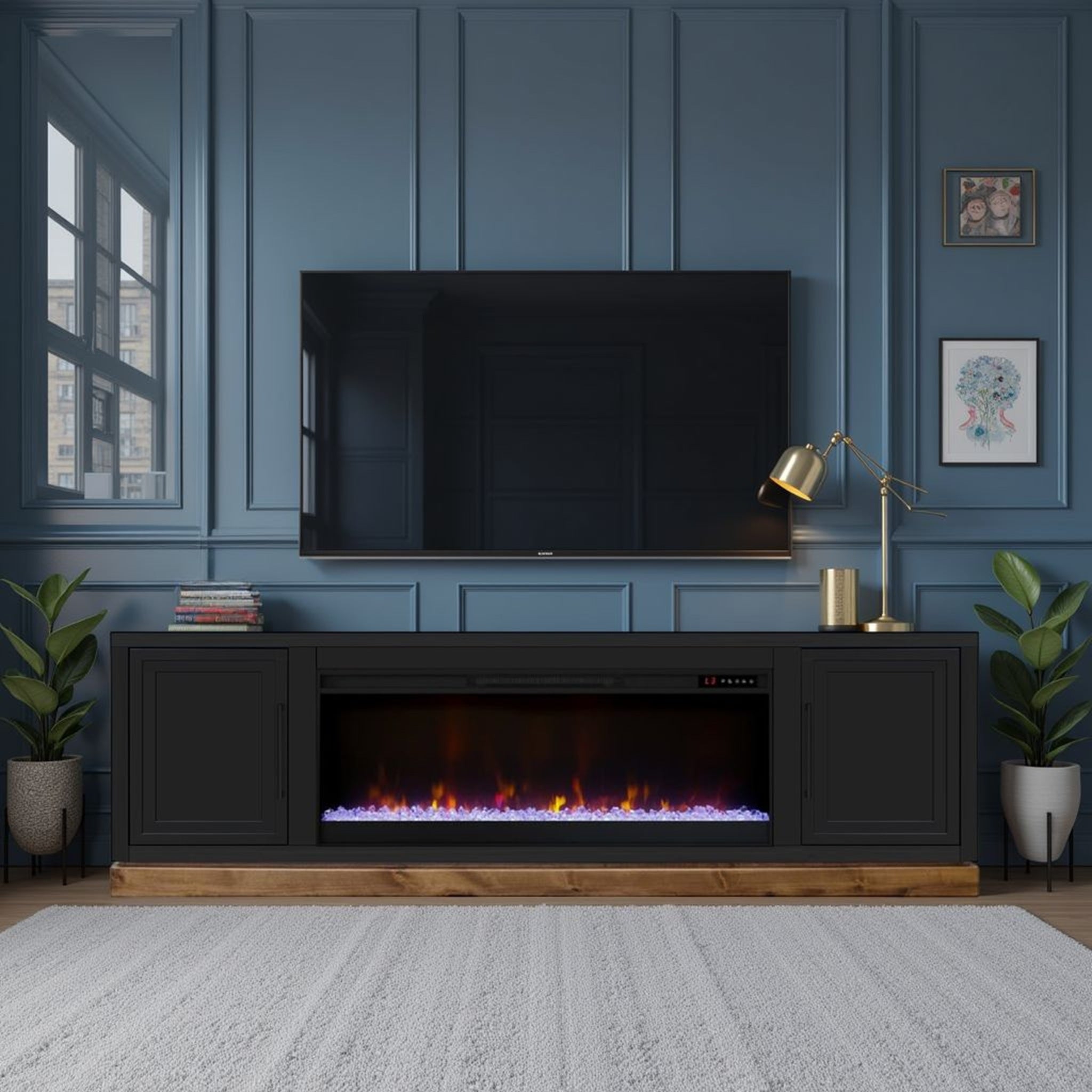 - Storage & Access: Two framed panel doors conceal interior shelving sized for media players and gaming consoles; sturdy platform base elevates the unit and contributes to the clean profile.