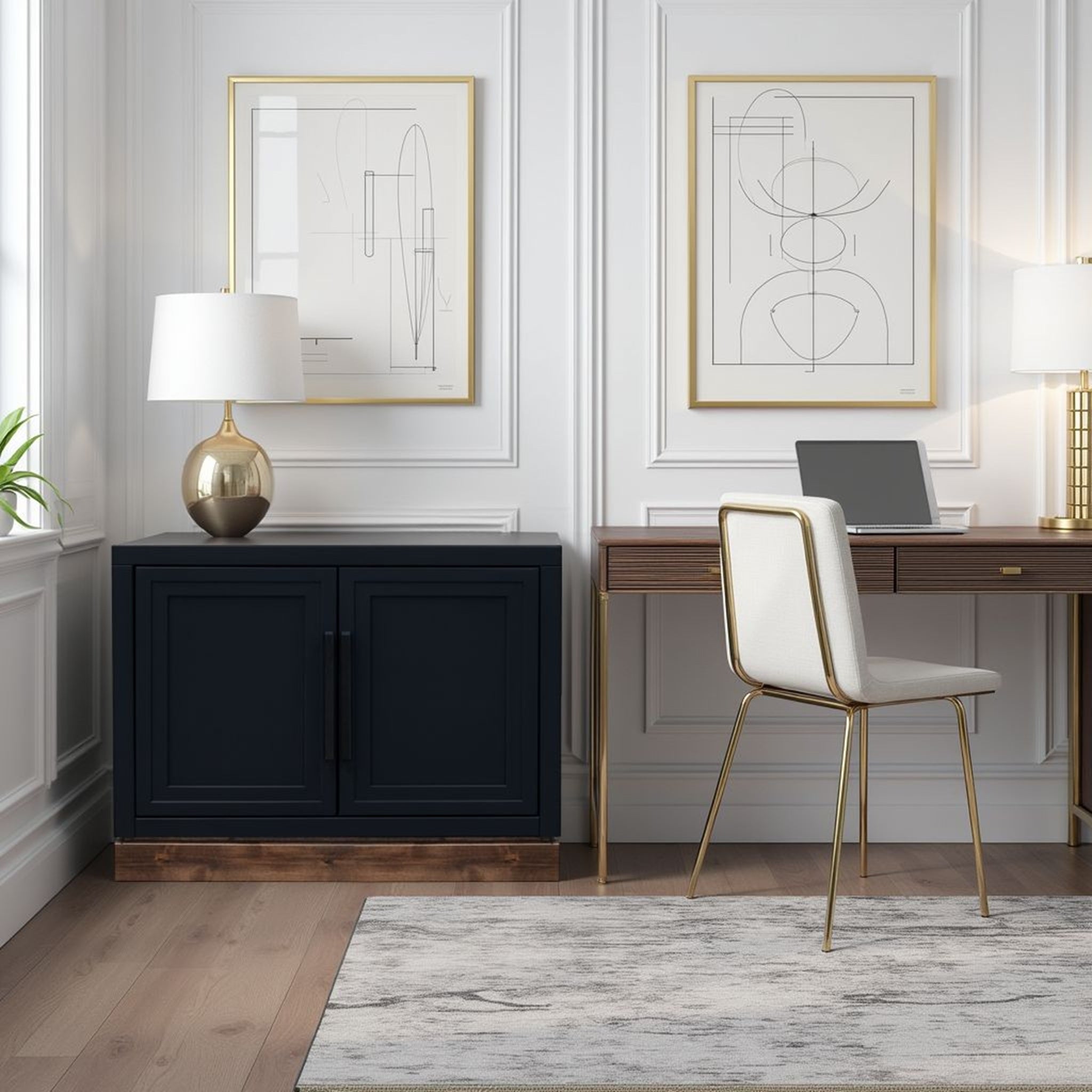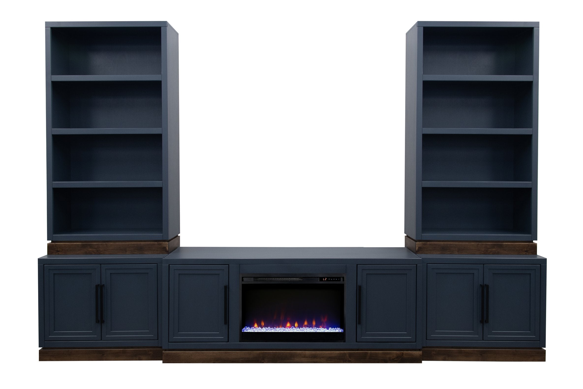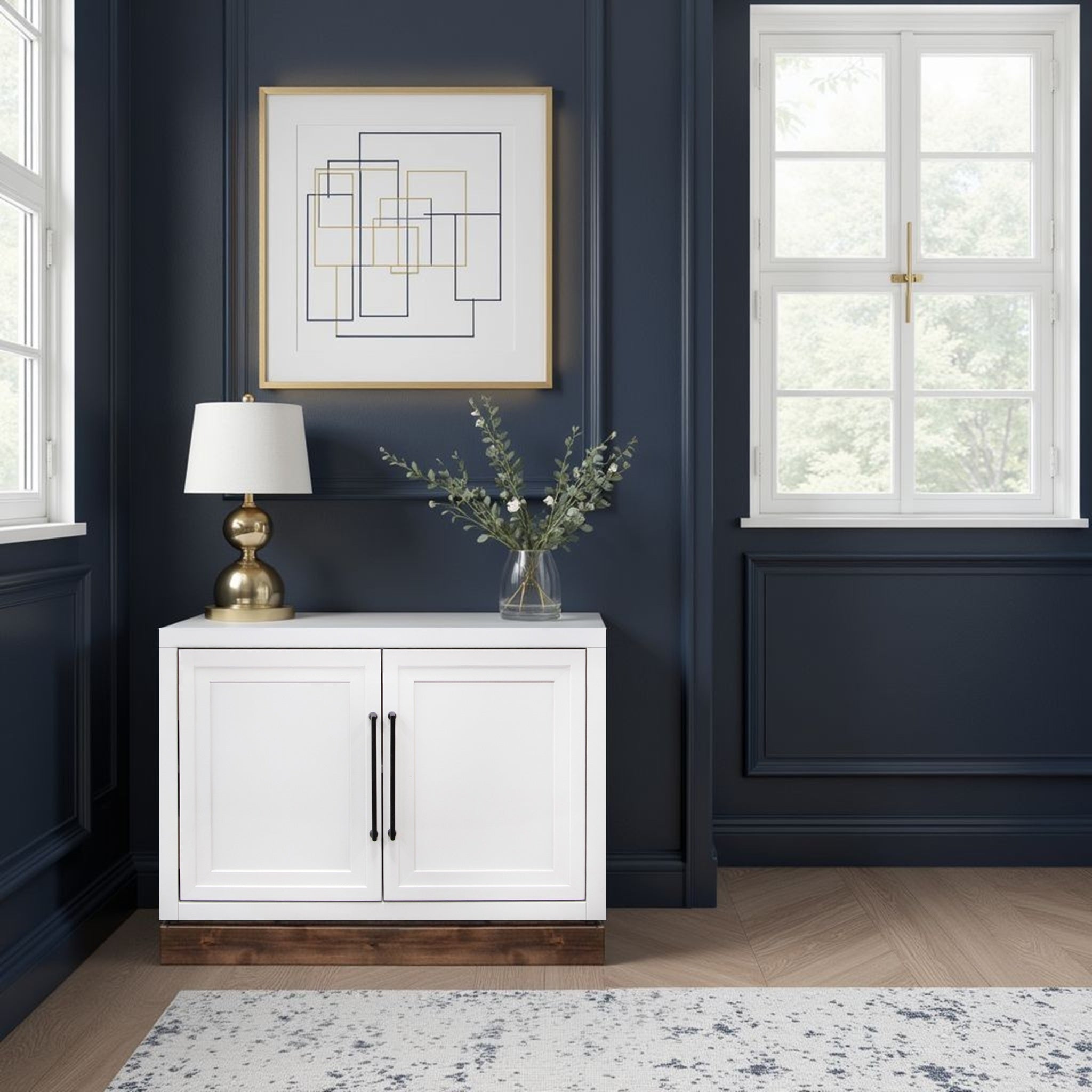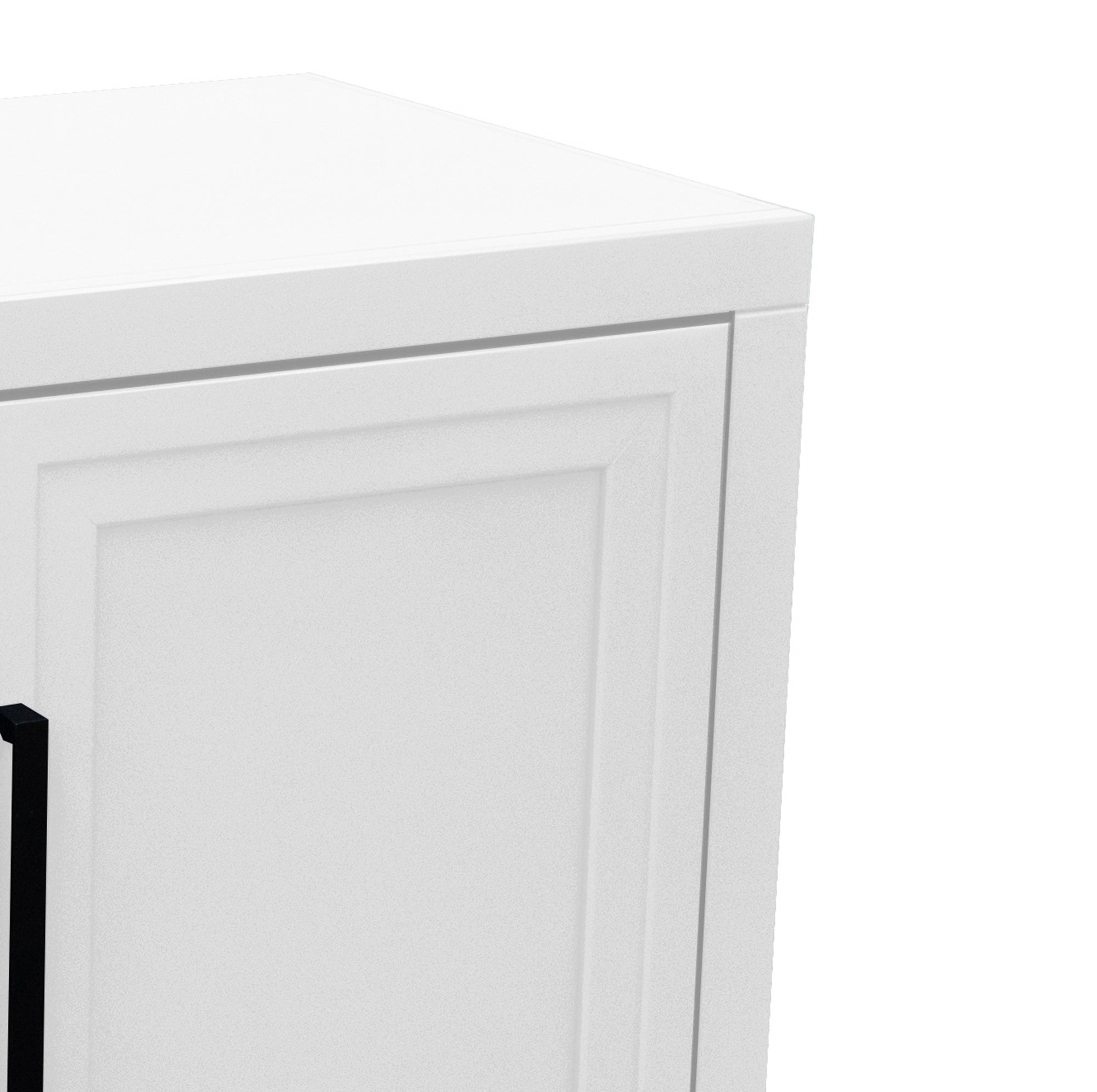 - Doors & Hardware: Two framed panel doors with matte black hardware provide a clean, modern front and concealed storage